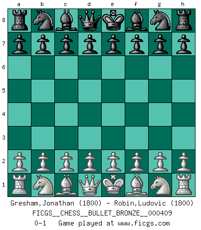 Last move : 0-1 2010 September 27 9:15:49 [Event "FICGS__CHESS__BULLET_BRONZE__000409"] [Site "FICGS"] [Date "2010.09.27"] [Round "1"] [White "Gresham,Jonathan"] [Black "Robin,Ludovic"] [Result "0-1"] [WhiteElo "1800"] [BlackElo "1800"] 0-1 This chess game has been lost on time (started : 2010.09.27 2:50:39) Player Black won this chess game. Follow this game move after move (download)Fischer wanted to give the Russians a taste of their own medicine. (Larry Evans) Ich kenne Menschen, die allen Willen der Welt besitzen und doch nicht Schach spielen können. (Robert James Fischer) Aún deseo matar a Fischer. (Boris Spassky) Toutes les manuvres exécutées sur une colonne ouverte ont pour but ultime l'intrusion définitive sur la septième ou la huitième rangée, en plein cur de la position ennemie. (Aaron Nimzovitch) Fame, I have already. Now I need the money. (an elderly Steinitz)