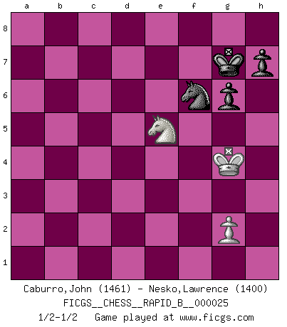 Last move : 1/2-1/2 2007 January 19 14:40:38 [Event "FICGS__CHESS__RAPID_B__000025"] [Site "FICGS"] [Date "2006.11.24"] [Round "1"] [White "Caburro,John"] [Black "Nesko,Lawrence"] [Result "1/2-1/2"] [WhiteElo "1461"] [BlackElo "1400"] 1.d4 d5 2.c4 Nf6 3.cxd5 Nxd5 4.Nf3 e6 5.e4 Bb4+ 6.Bd2 Bxd2+ 7.Qxd2 Ne7 8.Nc3 O-O 9.Bd3 Nbc6 10.e5 b6 11.O-O Bb7 12.Rfd1 Ng6 13.Be2 Nce7 14.Rac1 a6 15.h4 Bxf3 16.Bxf3 Nxh4 17.Bxa8 Qxa8 18.f3 Rd8 19.Ne4 Nef5 20.Qf4 Ng6 21.Qg4 Ne3 22.Qh5 Nxd1 23.Rxd1 Qd5 24.Nc3 Qc4 25.Qg4 c5 26.dxc5 Qxc5+ 27.Kh1 Rxd1+ 28.Nxd1 Qxe5 29.Qe4 Qxe4 30.fxe4 Ne5 31.Ne3 g6 32.Kg1 Kg7 33.Kf1 f5 34.exf5 exf5 35.Ke2 f4 36.Nd5 b5 37.Nxf4 Nc4 38.b3 Nd6 39.Nd5 Ne4 40.Ke3 Nf6 41.Nc7 Ng4+ 42.Kf4 Nf6 43.Nxa6 Nd5+ 44.Kf3 Nc3 45.Nb4 Kf6 46.Ke3 Ke6 47.Kd3 Nd1 48.a4 bxa4 49.bxa4 Nb2+ 50.Ke4 Nxa4 51.Nd3 Nc3+ 52.Kf4 Nd5+ 53.Kg5 Kf7 54.Ne5+ Kg7 55.Kg4 Nf6+ 1/2-1/2 QGD : Marshall defense Kingside Castling by player Black (move 8) Kingside Castling by player White (move 11) 10 pieces endgame at move 43 : White KNPPP , Black KNPPP WHITE : King + 1 Knight 3 Pawns BLACK : King + 1 Knight 3 Pawns 9 pieces endgame at move 48 : White KNPP , Black KNPPP WHITE : King + 1 Knight 2 Pawns BLACK : King + 1 Knight 3 Pawns 8 pieces endgame at move 49 : White KNPP , Black KNPP WHITE : King + 1 Knight 2 Pawns BLACK : King + 1 Knight 2 Pawns 7 pieces endgame at move 50 : White KNP , Black KNPP WHITE : King + 1 Knight 1 Pawn BLACK : King + 1 Knight 2 Pawns This chess game ended in a draw. Follow this game move after move (download)By playing at Chess then, we may learn: First: Foresight... Second: Circumspection... Third: Caution... And lastly, we learn by Chess the habit of not being discouraged by present bad appearances in the state of our affairs, the habit of hoping for a favorable chance, and that of persevering in the secrets of resources. (Benjamin Franklin) Es ist besser die Steine des Gegners zu opfern. (Savielly Grigorievitsch Tartakower) El Ajedrez es un expediente tonto que hace creer a la gente inactiva que hacen una cosa muy astuta cuando solamente estan perdiendo su tiempo. (George Bernard Shaw) Fischer est le meilleur joueur du monde et Karpov n'est qu'un joueur de bistrot. (Garry Kasparov, agé de 16 ans) You must do what you feel is right... of course. (Obi-Wan Kenobi in Star Wars ep.4)