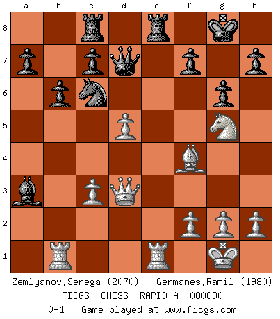 Last move : 0-1 2010 November 20 22:35:47 [Event "FICGS__CHESS__RAPID_A__000090"] [Site "FICGS"] [Date "2010.09.27"] [Round "1"] [White "Zemlyanov,Serega"] [Black "Germanes,Ramil"] [Result "0-1"] [WhiteElo "2070"] [BlackElo "1980"] 1.e4 e5 2.Nf3 Nf6 3.Nxe5 d6 4.Nf3 Nxe4 5.d4 d5 6.Bd3 Nc6 7.O-O Be7 8.c4 Nb4 9.Be2 O-O 10.Nc3 Bf5 11.a3 Nxc3 12.bxc3 Nc6 13.Re1 Re8 14.cxd5 Qxd5 15.Bf4 Rac8 16.Bd3 Qd7 17.Rb1 Bxd3 18.Qxd3 b6 19.d5 Bxa3 20.Ng5 g6 0-1 This chess game has been lost on time (started : 2010.09.27 11:4:49) Petrov : Classical attack Kingside Castling by player White (move 7) Kingside Castling by player Black (move 9) Player Black won this chess game. Follow this game move after move (download)Chess is a more highly symbolic game, but the aggressions are therefore even more frankly represented in the play. It probably began as a war game; that is, the representation of a miniature battle between the forces of two kingdoms. (Karl Meninger) Sie bekommen vielleicht den Eindruck, dass die Spitzenspieler überhaupt gar nicht so stark sind. Aber das stimmt nicht. Es ist eine Illusion. Mit einem Computer an der Seite ist es sehr leicht, Urteile zu fällen, aber wenn man alleine am Brett sitzt, sieht die Sache ganz anders aus. (Vladimir Kramnik) El Ajedrez es el gimnasio de la mente. (Blaise Pascal) Je fais ceci parce que dans cinquante coups j'obtiendrai cela; je m'appelle Mikhail Moisevitch Botvinnik. (Botvinnik) Happy endings are just stories that haven't finished yet. (Jane Smith in Mr & Mrs Smith)