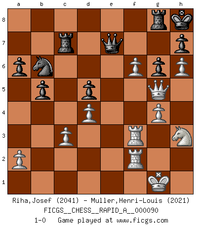 Last move : 1-0 2010 October 22 10:45:18 [Event "FICGS__CHESS__RAPID_A__000090"] [Site "FICGS"] [Date "2010.09.27"] [Round "1"] [White "Riha,Josef"] [Black "Muller,Henri-Louis"] [Result "1-0"] [WhiteElo "2041"] [BlackElo "2021"] 1.e4 c5 2.Nf3 d6 3.c3 Nf6 4.h3 Nc6 5.Bd3 g6 6.O-O Bg7 7.Bc2 O-O 8.d4 cxd4 9.cxd4 d5 10.e5 Ne4 11.Nc3 Bf5 12.Re1 Nxc3 13.bxc3 Bxc2 14.Qxc2 Rc8 15.h4 e6 16.h5 Re8 17.Qd3 Na5 18.Bg5 Qc7 19.Rac1 Qc4 20.Qd1 b6 21.Qd2 Qc7 22.h6 Nc4 23.Qe2 Bf8 24.Nh2 Be7 25.f4 b5 26.Ng4 Kh8 27.Qf2 Nb6 28.Re3 a6 29.Bf6+ Bxf6 30.Nxf6 Red8 31.g4 Qe7 32.f5 Rc7 33.fxe6 Qxe6 34.Qf3 Nc4 35.Re2 Nb6 36.Rd1 Rdc8 37.Rd3 Rd8 38.Rf2 Nc4 39.Qf4 Nb6 40.Rdf3 Rf8 41.Qg5 Rfc8 42.Nh5 Rg8 43.Nf4 Qe7 44.Nh3 f5 45.exf6 1-0 Sicilian Kingside Castling by player White (move 6) Kingside Castling by player Black (move 7) Player White won this chess game. Follow this game move after move (download)The game of chess is the touchstone of the intellect. (Goethe) Es war undenkbar für die Behörden, dass ein sowjetischer Großmeister auf diese Art und Weise [Fischer-Taimanov 6:0] verliert, ohne dass es eine politischer Erklärung dafür gäbe. (Mark Taimanov) A la fecha, Fischer esta simplemente un nivel arriba de todos los mejores jugadores de Ajedrez del mundo. (John Jacobs) J'apprécie les joueurs d'est-indienne, c'est grâce à eux que je nourris ma famille depuis tant d'années. (Petrosian) Two beer, or not two beer. (Unknown)