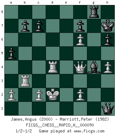 Last move : 1/2-1/2 2010 November 25 20:14:3 [Event "FICGS__CHESS__RAPID_A__000090"] [Site "FICGS"] [Date "2010.09.27"] [Round "1"] [White "James,Angus"] [Black "Marriott,Peter"] [Result "1/2-1/2"] [WhiteElo "2000"] [BlackElo "1982"] 1.e4 e5 2.Nf3 Nc6 3.Bb5 Nf6 4.Nc3 Bb4 5.O-O O-O 6.d3 d6 7.Bg5 Bxc3 8.bxc3 h6 9.Bh4 Qe7 10.Re1 Nd8 11.d4 Ne6 12.dxe5 dxe5 13.Nxe5 Qc5 14.Bxf6 Qxb5 15.Ng4 gxf6 16.Nxf6+ Kh8 17.e5 Qc4 18.Re3 a5 19.Rb1 Ra6 20.h4 Ng7 21.Re4 Qxc3 22.Rb3 Qc5 23.Qc1 Nf5 24.g4 Rxf6 25.exf6 Kh7 26.gxf5 Rg8+ 27.Kf1 Bxf5 28.Qf4 Qd5 29.Rd4 Qh1+ 30.Ke2 Bg4+ 31.Kd2 1/2-1/2 Ruy Lopez : Berlin defense Kingside Castling by player White (move 5) Kingside Castling by player Black (move 5) This chess game ended in a draw. Follow this game move after move (download)Chess is a fairy tale of 1001 blunders. (Savielly Tartakower) Wenn sie aufgeben, dann danke ich Ihnen für das Spiel (Eventualzug beim Fernschach). (Anonymous) ¿Porque tengo que perder ante este idiota?. (Aron Nimzovich) Le thème de l'attaque double intervient d'une manière ou d'une autre dans l'immense majorité des combinaisons. (Youri Averbakh) Humor is by far the most significant activity of the human brain. (Edward De Bono)