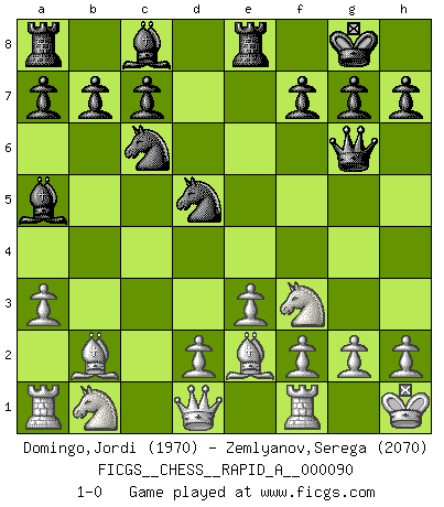 Last move : 1-0 2010 November 12 22:4:19 [Event "FICGS__CHESS__RAPID_A__000090"] [Site "FICGS"] [Date "2010.09.27"] [Round "1"] [White "Domingo,Jordi"] [Black "Zemlyanov,Serega"] [Result "1-0"] [WhiteElo "1970"] [BlackElo "2070"] 1.b4 e5 2.Bb2 Bxb4 3.Bxe5 Nf6 4.c4 Nc6 5.Bb2 O-O 6.e3 d5 7.cxd5 Nxd5 8.Nf3 Re8 9.Be2 Qd6 10.a3 Ba5 11.O-O Qg6 12.Kh1 1-0 This chess game has been lost on time (started : 2010.09.27 11:4:49) Polish (Sokolsky) opening Kingside Castling by player Black (move 5) Kingside Castling by player White (move 11) Player White won this chess game. Follow this game move after move (download)I love all positions. Give me a difficult positional game, I will play it. But totally won positions, I cannot stand them. (Hein Donner) Kritik überlasse ich den Spießern. Ich zeige nichts, wofür ich mich schämen muss. (Alexandra Kosteniuk) El Ajedrez es una manera fabulosa para que los niños aprendan a autovalorarse y a autoestimarse. (Saudin Robovic) Des points faibles ou des trous dans la position de l'adversaire doivent être occupés par des pièces et non pas par des pions. (Siegbert Tarrasch) Memory... is the diary that we all carry with us. (Oscar Wilde, The Importance of Being Earnest)