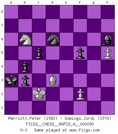Last move : 0-1 2011 March 19 12:29:38 [Event "FICGS__CHESS__RAPID_A__000090"] [Site "FICGS"] [Date "2010.09.27"] [Round "1"] [White "Marriott,Peter"] [Black "Domingo,Jordi"] [Result "0-1"] [WhiteElo "1982"] [BlackElo "1970"] 1.d4 d5 2.c4 dxc4 3.e4 Nf6 4.e5 Nd5 5.Bxc4 Nb6 6.Bd3 Nc6 7.Nf3 Bg4 8.Be3 Qd7 9.h3 Bh5 10.a3 O-O-O 11.Be4 f5 12.exf6 gxf6 13.Nc3 e6 14.Rc1 Kb8 15.Ne2 Ne7 16.Nf4 Bg6 17.Nxg6 hxg6 18.Qc2 g5 19.g4 Ned5 20.h4 gxh4 21.Rxh4 Rxh4 22.Nxh4 Bd6 23.Ng2 Rg8 24.Bf3 Rh8 25.Qd3 Rh3 26.Ke2 Qe8 27.Bd2 e5 28.Ne1 exd4 29.Kf1 Qe5 30.Qe2 Nf4 31.Qxe5 Bxe5 32.Bxf4 Bxf4 33.Rc5 c6 34.Rh5 Rxh5 35.gxh5 Kc7 36.Nd3 Bh6 37.Nc5 Nc4 38.b3 Nd2+ 39.Kg2 d3 40.Bd1 Nb1 41.Nxd3 Nxa3 42.Nc5 Nb5 43.Ne6+ Kb6 44.Kf3 Nd6 45.Ke2 Ka5 46.Kd3 Kb4 47.Kc2 c5 48.Nc7 f5 49.Nd5+ Ka3 50.Be2 b5 51.Ne7 a5 52.Bd3 b4 53.Nd5 a4 54.Nb6 axb3+ 0-1 This chess game has been lost on time (started : 2010.09.27 11:4:49) QGA : 3.e4 Queenside Castling by player Black (move 10) Player Black won this chess game. Follow this game move after move (download)Play the opening like a book, the middle game like a magician, and the endgame like a machine. (Spielmann) Schach ist Krieg, im Schach geht es um testosterongesteuerte Urschreie. (Garry Kasparov) El Ajedrez es sobre todo, ¡una pelea!. (Emanuel Lasker) Les Echecs sont affaire de jugement sensible. Savoir quand frapper et quand esquiver. (Fischer) Drag your thoughts away from your troubles... by the ears, by the heels, or any other way you can manage it. (Mark Twain)