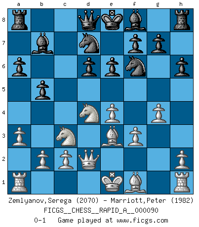 Last move : 0-1 2010 November 18 22:16:53 [Event "FICGS__CHESS__RAPID_A__000090"] [Site "FICGS"] [Date "2010.09.27"] [Round "1"] [White "Zemlyanov,Serega"] [Black "Marriott,Peter"] [Result "0-1"] [WhiteElo "2070"] [BlackElo "1982"] 1.e4 c5 2.Nf3 d6 3.d4 cxd4 4.Nxd4 Nf6 5.Nc3 a6 6.Be3 e6 7.f3 b5 8.a3 Bb7 9.Qd2 Nbd7 10.g4 h6 0-1 This chess game has been lost on time (started : 2010.09.27 11:4:49) Sicilian : Najdorf, Byrne (English) attack Player Black won this chess game. Follow this game move after move (download)I'm not afraid of Spassky. The world knows I'm the best. You don't need a match to prove it. (Bobby Fischer) Ich weiss nicht was Gott gegen mich auf 1.e4 antworten würde. (Robert James Fischer) El Ajedrez es el gimnasio de la mente. (Blaise Pascal) Le pion, dans sa simplicité, marche droit devant lui, mais lorsqu'il prend, il le fait obliquement? Ainsi l'homme, tant qu'il reste pauvre, marche dans la droiture et vit honnêtement, mais lorsqu'il recherche les honneurs, il flatte, se parjure et, par les voies obliques, cherche une position supérieure sur l'échiquier du monde. (Jean de Galles) Creativity is allowing yourself to make mistakes. Art is knowing which ones to keep. (Scott Adams)