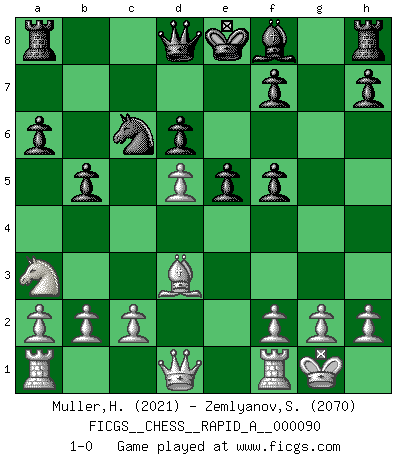 Last move : 1-0 2010 November 15 10:10:38 [Event "FICGS__CHESS__RAPID_A__000090"] [Site "FICGS"] [Date "2010.09.27"] [Round "1"] [White "Muller,Henri-Louis"] [Black "Zemlyanov,Serega"] [Result "1-0"] [WhiteElo "2021"] [BlackElo "2070"] 1.e4 c5 2.Nf3 Nc6 3.d4 cxd4 4.Nxd4 Nf6 5.Nc3 e5 6.Ndb5 d6 7.Bg5 a6 8.Na3 b5 9.Bxf6 gxf6 10.Nd5 f5 11.Bd3 Be6 12.O-O Bxd5 13.exd5 1-0 This chess game has been lost on time (started : 2010.09.27 11:4:49) Sicilian : Pelikan (Lasker/Sveshnikov) variation Kingside Castling by player White (move 12) Player White won this chess game. Follow this game move after move (download)During a Chess competition a Chessmaster should be a combination of a beast of prey and a monk. (Alexander Alekhine) Ich verachte Kasparow. (Viktor Kortschnoi) El Ajedrez es una guerra en un tablero. El objetivo es aplastar la mente del oponente. (Bobby Fischer) Le génie consiste à savoir transgresser les règles au moment opportun. (Teichmann) The faster the computer, the slower the brain. (Thibault de Vassal)