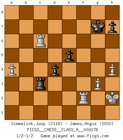 Last move : 1/2-1/2 2011 March 26 12:58:23 [Event "FICGS__CHESS__CLASS_A__000078"] [Site "FICGS"] [Date "2010.09.28"] [Round "1"] [White "Simmelink,Joop"] [Black "James,Angus"] [Result "1/2-1/2"] [WhiteElo "2118"] [BlackElo "2000"] 1.e4 c5 2.Nf3 d6 3.d4 cxd4 4.Nxd4 Nf6 5.Nc3 a6 6.Bg5 Nbd7 7.Bc4 Qb6 8.Qd2 Qxb2 9.Rb1 Qa3 10.O-O e6 11.Rfd1 Be7 12.Rb3 Qa5 13.R3b1 O-O 14.Nd5 Bd8 15.Nxf6+ Nxf6 16.Qxa5 Bxa5 17.Bxf6 gxf6 18.Be2 Bc7 19.Rb3 Re8 20.h4 b6 21.Rc3 Re7 22.Nc6 Rd7 23.a4 Bb7 24.Kh2 Rc8 25.Na7 d5 26.g3 Re8 27.Nc6 Be5 28.Nxe5 fxe5 29.Rb3 Rc8 30.c4 Rd6 31.exd5 exd5 32.Re3 f6 33.f4 d4 34.fxe5 R6d8 35.Rb3 fxe5 36.Rxb6 Rc7 37.Bd3 Re8 38.c5 Rf8 39.Rd2 Bf3 40.Bxa6 Rxc5 41.Bb7 Kg7 42.Bxf3 Rxf3 43.Ra2 Rfc3 44.Rf2 Rc6 45.Rxc6 1/2-1/2 Sicilian : Najdorf, 6.Bg5 Kingside Castling by player White (move 10) Kingside Castling by player Black (move 13) This chess game ended in a draw. Follow this game move after move (download)Chess is like war on a board. (Bobby Fischer) Es gibt nur zwei wahre Schachgenies - das andere war Wilhelm Steinitz, der Weltmeister von 1872 bis 1894. (Robert James Fischer) El juego del Ajedrez no es solamente una diversión quieta; algunas cualidades muy valuables de la mente se pueden adquirir y cultivar con el, como convertirlos en habitos disponibles para toda ocasión; ya que la vida es algo así como el Ajedrez. (Benjamin Franklin) Il n'y a pas eu de défaite parce que je ne crois pas que cet ordinateur ait jamais existé. IBM a triché en refusant d'imprimer les modes de recherche de la machine. C'est évident, pendant le match, des coups décisifs ont été joués par des êtres humains. Aujourd'hui, les meilleurs spécialistes en informatique ne peuvent toujours pas expliquer comment Deep-Blue a pu jouer contre la logique des ordinateurs. IBM a gagné une guerre de communication, mais ils sont incapables de prouver que l'ordinateur a gagné tout seul. (Garry Kasparov) When the going gets tactical, the computers get going. (Hyatt)
