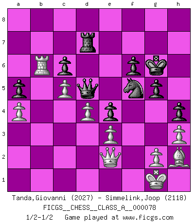 Last move : 1/2-1/2 2011 March 15 20:17:9 [Event "FICGS__CHESS__CLASS_A__000078"] [Site "FICGS"] [Date "2010.09.28"] [Round "1"] [White "Tanda,Giovanni"] [Black "Simmelink,Joop"] [Result "1/2-1/2"] [WhiteElo "2027"] [BlackElo "2118"] 1.d4 d5 2.Bf4 c6 3.Nf3 Qb6 4.Qc1 Nf6 5.e3 Bf5 6.c4 e6 7.Nc3 Nbd7 8.c5 Qd8 9.h3 Be7 10.b4 O-O 11.Be2 Ne4 12.O-O Bf6 13.Qb2 Re8 14.Rac1 Ng5 15.Nxg5 Bxg5 16.Bd6 Bf6 17.Rcd1 e5 18.b5 exd4 19.exd4 Nf8 20.Bd3 Qd7 21.bxc6 bxc6 22.Ne2 Be7 23.Bg3 Ng6 24.Bxf5 Qxf5 25.Rfe1 h5 26.Bh2 Bf6 27.Bd6 h4 28.Nc1 Rac8 29.Qc3 Re4 30.Rxe4 dxe4 31.Nb3 Bg5 32.Qc2 Qd5 33.Nd2 Re8 34.Nc4 Ne7 35.Ne3 Bxe3 36.fxe3 Nf5 37.Bf4 f6 38.Qe2 g5 39.Bh2 Kg7 40.Rb1 Kg6 41.a4 a5 42.Rb7 Re7 43.Rb6 Rd7 1/2-1/2 Queen's pawn, Mason variation Kingside Castling by player Black (move 10) Kingside Castling by player White (move 12) This chess game ended in a draw. Follow this game move after move (download)Blessed be the memory of him who gave the world this immortal game. (A. G. Gardiner) Ich hatte meine größten Erfolge, als ich 47 Jahre alt war. Kasparow war noch nicht mal 42 und hat das Schach schon im Stich gelassen. (Viktor Kortschnoi) Con o sin el título, Bobby Fischer fue sin lugar a dudas el mas grande jugador de su época. (Burt Hochberg) Si je n'étais pas joueur d'échecs, je serais le meilleur dans quelque chose d'autre. (Anatoli Karpov) Internet: Absolute communication, absolute isolation. (Paul Carvel)