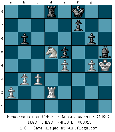 Last move : 1-0 2006 December 5 17:43:51 [Event "FICGS__CHESS__RAPID_B__000025"] [Site "FICGS"] [Date "2006.11.24"] [Round "1"] [White "Pena,Francisco"] [Black "Nesko,Lawrence"] [Result "1-0"] [WhiteElo "1400"] [BlackElo "1400"] 1.e4 e5 2.Nf3 Nc6 3.Bc4 Be7 4.d4 exd4 5.Nxd4 Nf6 6.Nf5 O-O 7.Qf3 Ne5 8.Qg3 Ng6 9.h4 Nh5 10.Qf3 Ne5 11.Qxh5 Nxc4 12.b3 Bf6 13.c3 Ne5 14.Bg5 g6 15.Nh6 Kh8 16.Bxf6 Qxf6 17.Ng4 Nd3+ 18.Kf1 Qf4 19.Qg5 d6 20.Qf6 Qxf6 21.Nxf6 Be6 22.h5 Kg7 23.Ke2 Ne5 24.f4 Kxf6 25.fxe5 dxe5 26.Ke3 Rad8 27.Nd2 Bg4 28.Ra1f1 Ke7 29.hxg6 hxg6 30.Nc4 Ke6 31.Na5 b6 32.Nc6 Rd6 33.Nxa7 Rfd8 34.Nb5 Rd3+ 35.Kf2 Rd2+ 36.Kg3 Bh5 37.Nxc7 Ke7 38.Nd5 Kf8 39.Rf2 Rd3+ 40.Kh4 Rd1 41.Rxd1 Bxd1 42.Rd2 Bh5 43.g4 1-0 Hungarian defense Kingside Castling by player Black (move 6) Player White won this chess game. Follow this game move after move (download)Not only will I predict his triumph over Botvinnik, but I'll go further and say that he'll probably be the greatest Chess player that ever lived. (John Collins) Habe Mut, dich deines eigenen Verstandes zu bedienen. (Immanuel Kant) Antes de los Finales, los dioses han colocado el Juego Medio. (Siegbert Tarrasch) Le moment que je préfère le plus dans une rencontre, c'est celui où je sens que la personnalité de l'adversaire se brise. (Robert Fischer) I fear not the man who has practiced 10,000 kicks once, but I fear the man who has practiced one kick 10,000 times. (Bruce Lee)