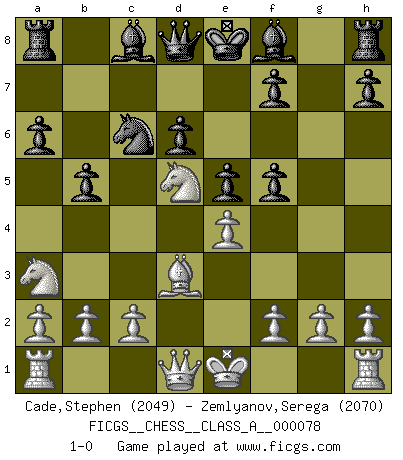 Last move : 1-0 2010 December 21 22:25:28 [Event "FICGS__CHESS__CLASS_A__000078"] [Site "FICGS"] [Date "2010.09.28"] [Round "1"] [White "Cade,Stephen"] [Black "Zemlyanov,Serega"] [Result "1-0"] [WhiteElo "2049"] [BlackElo "2070"] 1.e4 c5 2.Nf3 Nc6 3.d4 cxd4 4.Nxd4 Nf6 5.Nc3 e5 6.Ndb5 d6 7.Bg5 a6 8.Na3 b5 9.Bxf6 gxf6 10.Nd5 f5 11.Bd3 1-0 This chess game has been lost on time (started : 2010.09.28 18:50:34) Sicilian : Pelikan (Lasker/Sveshnikov) variation Player White won this chess game. Follow this game move after move (download)If a ruler does not understand Chess, how can he rule over a kingdom ? (King Khusros II) Pläne sind die Träume des Verständigen. (Ernst Freiherr von Feuchtersleben) Yo creo que el Ajedrez posee una magia que es también una ayuda en la edad avanzada. Una rodilla reumática es olvidada durante una partida de Ajedrez y otros eventos pueden parecer algo sin importancia comparada a una catástrofe en el tablero de Ajedrez. (Vlastimil Hort) D'abord les bases : Jouez et étudiez, puis étudiez et jouez, ensuite jouez et étudiez, puis étudiez et jouez. Deuxièmement : Donnez toujours le meilleur de vous-même ! (Ken Smith) Don't be irreplaceable, if you can't be replaced, you can't be promoted. (Dan Rotaru)