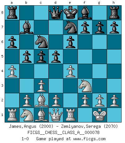 Last move : 1-0 2010 November 16 22:13:4 [Event "FICGS__CHESS__CLASS_A__000078"] [Site "FICGS"] [Date "2010.09.28"] [Round "1"] [White "James,Angus"] [Black "Zemlyanov,Serega"] [Result "1-0"] [WhiteElo "2000"] [BlackElo "2070"] 1.e4 c5 2.Nf3 Nc6 3.Bb5 e6 4.O-O Nge7 5.c3 a6 6.Ba4 b5 7.Bc2 Bb7 8.Re1 d5 9.a4 1-0 This chess game has been lost on time (started : 2010.09.28 18:50:34) Sicilian : Nimzovich-Rossolimo attack (without ...d6) Kingside Castling by player White (move 4) Player White won this chess game. Follow this game move after move (download)The boy (then a 12 year old boy named Anatoly Karpov) doesn't have a clue about Chess, and there's no future at all for him in this profession. (Mikhail Botvinnik) Es gibt Leute, die glauben, alles wäre vernünftig, was man mit einem ernsthaften Gesicht tut. (Georg Christoph Lichtenberg) ¿Quién es tu oponente esta tarde? Esta tarde mi oponente son las piezas negras. (Akiba Rubinstein) On n'a jamais que l'âge auquel on a commence à jouer aux échecs car après on cesse de vieillir. (Capablanca) I find television to be very educating. Every time somebody turns on the set, I go in the other room and read a book. (Groucho Marx)