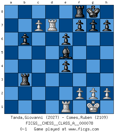 Last move : 0-1 2010 December 30 0:43:19 [Event "FICGS__CHESS__CLASS_A__000078"] [Site "FICGS"] [Date "2010.09.28"] [Round "1"] [White "Tanda,Giovanni"] [Black "Comes,Ruben"] [Result "0-1"] [WhiteElo "2027"] [BlackElo "2109"] 1.d4 Nf6 2.Nf3 d5 3.Bf4 c5 4.dxc5 e6 5.b4 a5 6.c3 axb4 7.Bxb8 Rxb8 8.cxb4 b6 9.c6 Bxb4+ 10.Nbd2 Ra8 11.e3 Ne4 12.Bb5 O-O 13.Qc2 Qf6 14.O-O Nxd2 15.Nxd2 Qc3 16.Qxc3 Bxc3 17.Rad1 Rxa2 18.Nb3 Ba6 19.Bxa6 Rxa6 20.e4 dxe4 21.c7 Be5 22.Rd7 Ra3 23.Re1 Rxb3 0-1 Queen's pawn game Kingside Castling by player Black (move 12) Kingside Castling by player White (move 14) Player Black won this chess game. Follow this game move after move (download)The hallmark of the artist is simplicity. (Larry Evans) Den Ruhm habe ich schon, jetzt brauche ich noch das Geld. (Wilhelm Steinitz) Fischer era un maestro de claridad y un Rey del posicionamiento astuto. Sus oponentes podían ver hacia donde se dirigía pero eran impotentes para detenerlo. (Bruce Pandolfini) Le jeu d'échecs fait naître et fortifie en nous plusieurs qualités précieuses dans le cours de l'existence, telles que la prévoyance, la circonspection, la prudence, et la persévérance. (Benjamin Franklin - 1783, la morale des échecs) Nothing is more important for teaching us to understand the concepts we have than constructing fictitious ones. (Ludwig Wittgenstein)