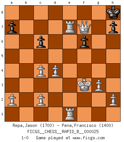 Last move : 1-0 2007 January 3 19:26:50 [Event "FICGS__CHESS__RAPID_B__000025"] [Site "FICGS"] [Date "2006.11.24"] [Round "1"] [White "Repa,Jason"] [Black "Pena,Francisco"] [Result "1-0"] [WhiteElo "1700"] [BlackElo "1400"] 1.e4 e5 2.Nf3 Nc6 3.Bb5 Nf6 4.O-O d5 5.Nxe5 Qd6 6.Bxc6+ bxc6 7.exd5 Qxd5 8.Nc3 Qd6 9.d4 Be7 10.Bg5 O-O 11.Re1 Bb7 12.Bxf6 Bxf6 13.Ne4 Qe6 14.Nxf6+ gxf6 15.Ng6 Qd5 16.Ne7+ Kg7 17.Nxd5 cxd5 18.Re7 Ra8c8 19.Qh5 Ba6 20.Rae1 Bb5 21.Qxd5 c6 22.Qd7 Bc4 23.b3 Rc8d8 24.Qg4+ Kh8 25.bxc4 Rg8 26.Qh5 Rg8g5 27.Qxf7 Rxg2 28.Kxg2 Rg8 29.Kf3 Rg3+ 30.fxg3 1-0 Ruy Lopez : Berlin defense, 4.O-O Kingside Castling by player White (move 4) Kingside Castling by player Black (move 10) Player White won this chess game. Follow this game move after move (download)Play the opening like a book, the middle game like a magician, and the endgame like a machine. (Spielmann) Schach ist Krieg, im Schach geht es um testosterongesteuerte Urschreie. (Garry Kasparov) El Ajedrez es sobre todo, ¡una pelea!. (Emanuel Lasker) Il a essayé de se convaincre qu'il pourrait empêcher toutes les erreurs et ne jamais perdre. L'horreur ! Gary Kasparov au sujet de Robert Fischer. Warrior pose battles inner weakness and wins focus. You see that there is no war within you. You're on your own side, and you are your own strength. (Terri Guillemets)