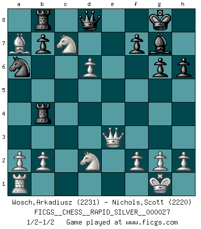 Last move : 1/2-1/2 2010 November 23 19:40:53 [Event "FICGS__CHESS__RAPID_SILVER__000027"] [Site "FICGS"] [Date "2010.09.30"] [Round "2"] [White "Wosch,Arkadiusz"] [Black "Nichols,Scott"] [Result "1/2-1/2"] [WhiteElo "2231"] [BlackElo "2220"] 1.d4 Nf6 2.Nf3 g6 3.c4 Bg7 4.Nc3 d5 5.Qb3 dxc4 6.Qxc4 O-O 7.e4 Na6 8.Be2 c5 9.d5 e6 10.O-O exd5 11.exd5 Re8 12.Rd1 Bf5 13.d6 h6 14.Bf4 Nd7 15.Rd2 Nb4 16.Qb3 Be6 17.Bc4 Nb6 18.Bxe6 Rxe6 19.Nb5 Re4 20.Be3 Nc4 21.Nc7 Rb8 22.Bxc5 Na6 23.Bxa7 Nxd2 24.Nxd2 Rb4 25.Qe3 1/2-1/2 King's Indian : East Indian defense Kingside Castling by player Black (move 6) Kingside Castling by player White (move 10) This chess game ended in a draw. Follow this game move after move (download)The beauty of a move lies not in its' appearance but in the thought behind it. (Siegbert Tarrasch) Rauchen ist dem Schachspieler bei seiner Arbeit, also im Wettkampf, untersagt. (Viktor Kortschnoi) No todos los artistas son jugadores de Ajedrez, pero todos los jugadores de Ajedrez son artistas. (Marcel Duchamp) La tactique est l'élément le plus important du milieu de jeu. (Siegbert Tarrasch) Ah, beer! The cause of, and the solution to, all of life's problems. (Homer Simpson)