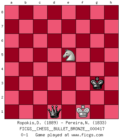 Last move : 0-1 2010 September 30 20:22:28 [Event "FICGS__CHESS__BULLET_BRONZE__000417"] [Site "FICGS"] [Date "2010.09.30"] [Round "1"] [White "Ropokis,Dimitrios"] [Black "Pereira,Nilson"] [Result "0-1"] [WhiteElo "1889"] [BlackElo "1833"] 1.e4 c5 2.Nc3 d6 3.f4 Nc6 4.Nf3 g6 5.Bb5 Bd7 6.O-O Bg7 7.a4 Nf6 8.d3 O-O 9.Be3 a6 10.Bxc6 Bxc6 11.h3 b5 12.a5 Rb8 13.Ne2 b4 14.Qb1 e6 15.Qa2 Qc7 16.Bf2 Nd7 17.Rad1 Rb5 18.Ra1 Qb7 19.Qb3 Re8 20.Nd2 d5 21.e5 d4 22.Ne4 Bxe4 23.dxe4 Qxe4 24.Rfe1 Qd5 25.Qd3 f6 26.exf6 Nxf6 27.Nc1 Qf5 28.Re5 Qxd3 29.cxd3 Nd5 30.Re4 b3 31.g3 Kf7 32.Kg2 e5 33.Ra3 exf4 34.Rxe8 Kxe8 35.Rxb3 Nb4 36.gxf4 Rxa5 37.Ra3 Rxa3 38.bxa3 Nc2 39.a4 Kd7 40.Kf3 Kd6 41.Ke4 Nb4 42.Bg3 Nd5 43.f5 Kc6 44.fxg6 hxg6 45.Bh4 Nc3+ 46.Kf4 Bf8 47.Bd8 Nxa4 48.Kg5 Nb2 49.h4 c4 50.dxc4 d3 51.Ba5 Nxc4 52.Nxd3 Nxa5 53.Kxg6 Nc4 54.Kf7 Bh6 55.Kg6 Bd2 56.h5 a5 57.h6 Bxh6 58.Kxh6 a4 59.Kg5 a3 60.Kf5 Kb5 61.Nc1 Na5 62.Ke4 Kc4 63.Ke3 Nb3 64.Na2 Nc5 65.Kd2 Kb3 66.Nc3 Ne4+ 67.Nxe4 a2 68.Kd3 a1Q 69.Nd2+ Kb4 70.Nf3 Kc5 71.Ke3 Qa4 72.Ne1 Kd5 73.Ng2 Qd4+ 74.Kf3 Qd3+ 75.Kf2 Qf5+ 76.Ke3 Qh3+ 77.Kf2 Ke4 78.Ne1 Qe3+ 79.Kf1 Qd2 80.Ng2 Kf5 81.Nh4+ Kg4 82.Ng6 Kg3 83.Ne5 Qd1+ 0-1 This chess game has been lost on time (started : 2010.09.30 19:20:12) Sicilian : Closed Kingside Castling by player White (move 6) Kingside Castling by player Black (move 8) 10 pieces endgame at move 51 : White KBNP , Black KBNPPP WHITE : King + 1 Bishop 1 Knight 1 Pawn BLACK : King + 1 Bishop 1 Knight 3 Pawns 9 pieces endgame at move 52 : White KBNP , Black KBNPP WHITE : King + 1 Bishop 1 Knight 1 Pawn BLACK : King + 1 Bishop 1 Knight 2 Pawns 8 pieces endgame at move 52 : White KNP , Black KBNPP WHITE : King + 1 Knight 1 Pawn BLACK : King + 1 Bishop 1 Knight 2 Pawns 7 pieces endgame at move 53 : White KNP , Black KBNP WHITE : King + 1 Knight 1 Pawn BLACK : King + 1 Bishop 1 Knight 1 Pawn 6 pieces endgame at move 57 : White KN , Black KBNP WHITE : King + 1 Knight BLACK : King + 1 Bishop 1 Knight 1 Pawn 5 pieces endgame at move 58 : White KN , Black KNP WHITE : King + 1 Knight BLACK : King + 1 Knight 1 Pawn 4 pieces endgame at move 67 : White KN , Black KP WHITE : King + 1 Knight BLACK : King + 1 Pawn Promotion Queen by player Black (move 68) Player Black won this chess game. Follow this game move after move (download)The tactician knows what to do when there is something to do; whereas the strategian knows what to do when there is nothing to do. (Gerald Abrahams) Schach verlangt totale Konzentration. (Robert James Fischer) Ayuda a tus piezas para que ellas te puedan ayudar. (Paul Morphy) Celui qui prend des risques peut perdre, celui qui n'en prend pas perd toujours. (Xavier Tartacover) Quotation,n.: The act of repeating erroneously the words of another. The words erroneously repeated. (Ambrose Bierce, The Devil's Dictionary)