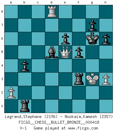 Last move : 0-1 2010 September 30 21:7:24 [Event "FICGS__CHESS__BULLET_BRONZE__000418"] [Site "FICGS"] [Date "2010.09.30"] [Round "1"] [White "Legrand,Stephane"] [Black "Nookala,Kamesh"] [Result "0-1"] [WhiteElo "2196"] [BlackElo "2357"] 1.d4 d5 2.c4 c6 3.Nf3 Nf6 4.e3 e6 5.Nc3 Nbd7 6.Bd3 dxc4 7.Bxc4 b5 8.Bd3 Bb7 9.e4 b4 10.Na4 c5 11.e5 Nd5 12.Nxc5 Nxc5 13.dxc5 Bxc5 14.O-O h6 15.Nd2 Qc7 16.Re1 O-O 17.Qg4 f5 18.Qg3 Kh8 19.Nb3 Bb6 20.Bd2 Qe7 21.Rac1 Rac8 22.Qg6 Qd7 23.Rcd1 Rfd8 24.Bf1 Rc2 25.Be3 Rxb2 26.Bxb6 axb6 27.Nd4 Nf4 28.Qg3 Qxd4 29.Rxd4 Rxd4 30.Rc1 Bd5 31.Qe3 Re4 32.Qxb6 Nxg2 33.h3 Ne1 34.Qb8+ Kh7 35.Rc8 Nf3+ 36.Kg2 Nxe5 37.Rh8+ Kg6 38.Kg1 Re1 39.Rd8 R2b1 40.Kh2 Rxf1 41.Qxe5 Rxf2+ 42.Kg3 Rf3+ 0-1 QGD Slav : 4.e3 Kingside Castling by player White (move 14) Kingside Castling by player Black (move 16) Player Black won this chess game. Follow this game move after move (download)At this time Fischer is simply a level above all the best Chessplayers in the world. (John Jacobs) Vom Schach wurde gesagt das Leben sei dafür nicht lange genug. Aber das ist der Fehler des Lebens, nicht des Schach'. (Irving Chernev) Durante una competencia de Ajedrez, un Maestro de Ajedrez deberá ser una combinación de presa de caza y un Monge. (Alexander Alekhine) Des idées, des idées, j'en ai cent, j'en ai mille. Des bonnes, des mauvaises, applicables, irréalisables... Il suffit de faire le tri ! (Roos) Dave, my mind is going. I can feel it. (HAL 9000 in 2001, a space odyssey)