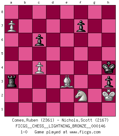 Last move : 1-0 2010 October 1 0:34:0 [Event "FICGS__CHESS__LIGHTNING_BRONZE__000146"] [Site "FICGS"] [Date "2010.09.30"] [Round "1"] [White "Comes,Ruben"] [Black "Nichols,Scott"] [Result "1-0"] [WhiteElo "2361"] [BlackElo "2167"] 1.e4 d5 2.exd5 Qxd5 3.Nf3 Nf6 4.Nc3 Qa5 5.d4 c6 6.Bc4 Bf5 7.Nh4 Bg4 8.Qd2 e6 9.f3 Bh5 10.O-O Nbd7 11.Ne2 Qxd2 12.Bxd2 h6 13.g4 g5 14.gxh5 gxh4 15.f4 Be7 16.Kg2 Nxh5 17.f5 e5 18.Rae1 Kf8 19.dxe5 Nxe5 20.Bb3 Rd8 21.Be3 c5 22.Nf4 Nf6 23.Bc1 Nc6 24.c3 Ng4 25.Re4 h5 26.Re2 Nf6 27.Kh3 Rg8 28.Bc4 Rg7 29.Bb5 a6 30.Bxc6 bxc6 31.b3 Rd7 32.c4 Rg8 33.Rfe1 a5 34.Bb2 Rg5 35.Rxe7 Rxe7 36.Bxf6 Rxe1 37.Bxg5 a4 38.Nd3 Re2 39.bxa4 Re4 40.Nb2 Re2 41.Bf6 Rf2 42.a5 Rxf5 43.Bd8 Rf3+ 44.Kxh4 Rf2 45.Na4 Rxh2+ 46.Kg3 Rxa2 47.Nxc5 Kg7 48.Bb6 Kh6 49.a6 Kg5 50.a7 h4+ 51.Kf3 Ra3+ 52.Nd3 h3 53.Kf2 Kh4 54.Kg1 Ra1+ 55.Kh2 Ra2+ 56.Nf2 Ra3 57.Be3 1-0 Scandinavian (centre counter) defense Kingside Castling by player White (move 10) 10 pieces endgame at move 47 : White KBNPP , Black KRPPP WHITE : King + 1 Bishop 1 Knight 2 Pawns BLACK : King + 1 Rook 3 Pawns Player White won this chess game. Follow this game move after move (download)A great player and a great example for many. His book My 60 Memorable Games had a big impact on me. It is a shame he didn't continue to enrich the world of chess with his unparalleled understanding after 1972. (Jan Timman, about Bobby Fischer's death) Privat ist Kortschnoi kein schlechter Mensch, sehr sympathisch. Aber während des Spiels ist er grausam. Er will dich töten. (Miguel Najdorf) Una victoria por una combinación errónea, aunque sea espectacular, me llena de horror artístico. (Wilhelm Steinitz) Les échecs, c'est l'art d'analyser. (Mikhail Botvinnik) Life is painting a picture, not doing a sum. (Oliver Wendell Holmes, Jr.)