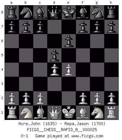 Last move : 0-1 2006 December 29 2:48:49 [Event "FICGS__CHESS__RAPID_B__000025"] [Site "FICGS"] [Date "2006.11.24"] [Round "1"] [White "Acre,John"] [Black "Repa,Jason"] [Result "0-1"] [WhiteElo "1635"] [BlackElo "1700"] 1.d4 e6 2.e4 d5 0-1 This chess game has been lost on time (started : 2006.11.24 16:0:33) Queen's pawn Player Black won this chess game. Follow this game move after move (download)A big shock; the best chess player in history has passed away. (Lajos Portisch, about Bobby Fischer's death) Privat ist Kortschnoi kein schlechter Mensch, sehr sympathisch. Aber während des Spiels ist er grausam. Er will dich töten. (Miguel Najdorf) La maestría del Ajedrez consiste esencialmente en analizar posiciónes de Ajedrez con precisión. (Mikhail Botvinnik) La tactique, c'est ce que vous faites quand il y a quelque chose à faire; la stratégie, c'est ce que vous faites quand il n'y a rien à faire. (Savielli Tartacower) The Movers & Shakers of this world are those who play chess in the mornings and go to the disco in the evenings. (Dinesh De Silva)