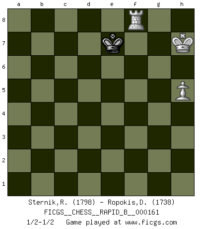 Last move : 1/2-1/2 2010 November 19 20:10:47 [Event "FICGS__CHESS__RAPID_B__000161"] [Site "FICGS"] [Date "2010.10.02"] [Round "1"] [White "Sternik,Ryszard"] [Black "Ropokis,Dimitrios"] [Result "1/2-1/2"] [WhiteElo "1798"] [BlackElo "1738"] 1.e4 c6 2.d4 d5 3.Nc3 dxe4 4.Nxe4 Bf5 5.Ng3 g6 6.Nxf5 Qa5+ 7.c3 Qxf5 8.Bd3 Qe6+ 9.Ne2 Bg7 10.O-O Nf6 11.Ng3 O-O 12.Re1 Qd6 13.Qf3 Na6 14.Bf4 Qd7 15.Bxa6 bxa6 16.Be5 Rae8 17.c4 Rd8 18.Rad1 Qb7 19.b3 Rfe8 20.a3 a5 21.Rb1 Nd7 22.Bxg7 Kxg7 23.Ne4 Qc7 24.Rbd1 f5 25.Nc3 e5 26.d5 e4 27.Qe3 Ne5 28.dxc6 Nd3 29.Nd5 Qxc6 30.Qxa7+ Rd7 31.Qd4+ Kf7 32.Re3 Nf4 33.f3 Nxd5 34.cxd5 Qc2 35.fxe4 Rxe4 36.Rxe4 Qxe4 37.Qc4 Qe5 38.b4 Rc7 39.Qd3 Rc3 40.Qd2 Qe3+ 41.Qxe3 Rxe3 42.d6 Ke8 43.d7+ Kd8 44.bxa5 Rxa3 45.Rd5 Ra2 46.Kf1 h5 47.Kg1 h4 48.Kf1 Ra3 49.Kf2 h3 50.gxh3 Rxh3 51.Kg2 Ra3 52.Kf1 Ra2 53.Kg1 Rc2 54.a6 Ra2 55.Rd6 g5 56.Rg6 Kxd7 57.a7 Ra1+ 58.Kg2 Ra2+ 59.Kf3 Ra3+ 60.Ke2 Ra2+ 61.Kd3 Ra3+ 62.Kd4 Kc7 63.Rxg5 Kb7 64.Ke5 Rh3 65.Rg2 Kxa7 66.Kxf5 Kb7 67.Kg4 Rh6 68.h4 Rg6+ 69.Kh3 Rh6 70.Rg8 Kc7 71.Kg4 Kd7 72.Kg5 Rd6 73.h5 Rd2 74.Rf8 Ke7 75.Rf1 Rg2+ 76.Kh6 Rg8 77.Kh7 Rf8 78.Rxf8 1/2-1/2 Caro-Kann : Classical variation Kingside Castling by player White (move 10) Kingside Castling by player Black (move 11) 10 pieces endgame at move 50 : White KRPPPP , Black KRPP WHITE : King + 1 Rook 4 Pawns BLACK : King + 1 Rook 2 Pawns 9 pieces endgame at move 50 : White KRPPP , Black KRPP WHITE : King + 1 Rook 3 Pawns BLACK : King + 1 Rook 2 Pawns 8 pieces endgame at move 56 : White KRPP , Black KRPP WHITE : King + 1 Rook 2 Pawns BLACK : King + 1 Rook 2 Pawns 7 pieces endgame at move 63 : White KRPP , Black KRP WHITE : King + 1 Rook 2 Pawns BLACK : King + 1 Rook 1 Pawn 6 pieces endgame at move 65 : White KRP , Black KRP WHITE : King + 1 Rook 1 Pawn BLACK : King + 1 Rook 1 Pawn 5 pieces endgame at move 66 : White KRP , Black KR WHITE : King + 1 Rook 1 Pawn BLACK : King + 1 Rook 4 pieces endgame at move 78 : White KRP , Black K WHITE : King + 1 Rook 1 Pawn BLACK : King + This chess game ended in a draw. Follow this game move after move (download)Who is your opponent tonight, tonight I am playing against the Black pieces. (Akiba Rubinstein) Fallen sollten polizeilich verboten werden. (Savielly Grigorievitsch Tartakower) El Ajedrez es un juego de pelea el cual es puramente intelectual e incluye la suerte. (Richard Reti) Je menace de comprendre la position. (Anonyme) The quality of decision is like the well-timed swoop of a falcon which enables it to strike and destroy its victim. (Sun Tzu)