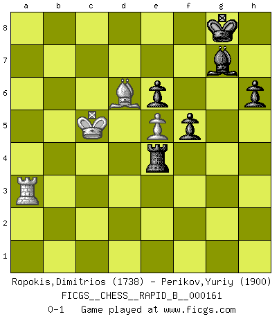 Last move : 0-1 2010 October 31 15:24:25 [Event "FICGS__CHESS__RAPID_B__000161"] [Site "FICGS"] [Date "2010.10.02"] [Round "1"] [White "Ropokis,Dimitrios"] [Black "Perikov,Yuriy"] [Result "0-1"] [WhiteElo "1738"] [BlackElo "1900"] 1.e4 c5 2.Nc3 d6 3.f4 Nc6 4.Nf3 g6 5.Bb5 Bg7 6.a4 a6 7.Bxc6+ bxc6 8.O-O Nf6 9.d3 O-O 10.h3 a5 11.Qe1 Qb6 12.b3 Ne8 13.Be3 Nc7 14.g4 d5 15.Bd2 c4 16.Qf2 Qxf2+ 17.Rxf2 cxb3 18.cxb3 dxe4 19.dxe4 Be6 20.e5 Rfd8 21.Kh2 Bxb3 22.Rb1 Rab8 23.Ne4 Bd5 24.Re1 Ra8 25.Nd4 Rdc8 26.Nc5 Rcb8 27.Nd7 Rb2 28.Rg1 Na6 29.Rc1 Ra7 30.Nc5 Nxc5 31.Rxc5 e6 32.Nxc6 Rc7 33.Rb5 Rxb5 34.axb5 Bxc6 35.bxc6 a4 36.Bb4 Rxc6 37.Bd6 h6 38.Ra2 Rc4 39.Kg3 Bf8 40.Rb2 Rc8 41.Kf3 a3 42.Rd2 Rc3+ 43.Ke4 Rxh3 44.Rc2 f5+ 45.Kd4 Bg7 46.gxf5 gxf5 47.Ra2 Rf3 48.Rxa3 Rxf4+ 49.Kc5 Re4 0-1 Sicilian : Closed Kingside Castling by player White (move 8) Kingside Castling by player Black (move 9) 10 pieces endgame at move 48 : White KRBP , Black KRBPPP WHITE : King + 1 Rook 1 Bishop 1 Pawn BLACK : King + 1 Rook 1 Bishop 3 Pawns Player Black won this chess game. Follow this game move after move (download)Bobby just drops the pieces and they fall on the right squares. (Miguel Najdorf) Frage: Wie viele Autos haben Sie schon zerstört? - Antwort: Nur zwei. (Loek van Wely) Las leyes del Ajedrez no permiten una libre elección: tienes que mover quieras o no. (Emanuel Lasker) Les Echecs mettent en conflit, non pas deux intelligences, mais deux volontés. (Lasker) Vladimir Ras-Putin is still alive... He is also a good actor, I saw him in the Lord of the Rings. (Rodolfo d'Ettorre)