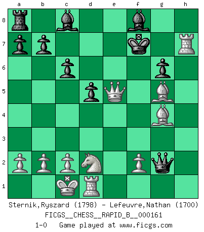 Last move : 1-0 2010 November 21 6:55:37 [Event "FICGS__CHESS__RAPID_B__000161"] [Site "FICGS"] [Date "2010.10.02"] [Round "1"] [White "Sternik,Ryszard"] [Black "Lefeuvre,Nathan"] [Result "1-0"] [WhiteElo "1798"] [BlackElo "1700"] 1.e4 e5 2.Nf3 f6 3.Bc4 c6 4.Nxe5 fxe5 5.Qh5+ g6 6.Qxe5+ Qe7 7.Qxh8 Qxe4+ 8.Be2 Qxg2 9.Rf1 Ne7 10.d4 Qxh2 11.Bg5 d5 12.Nd2 Nf5 13.O-O-O Nxd4 14.Qxd4 Nd7 15.Bg4 Ne5 16.Rh1 Qg2 17.Qxe5+ Kf7 18.Rxh7+ 1-0 Damiano's defense Queenside Castling by player White (move 13) Player White won this chess game. Follow this game move after move (download)The enormous mental resilience, without which no Chess player can exist, was so much taken up by Chess that he could never free his mind of this game. (Albert Einstein) Nie in meinem Leben habe ich die französische Verteidigung gespielt, welche die Stumpfsinnigste von allen ist. (Wilhelm Steinitz) Evita las multitudes. Haz independientemente tu propio razonamiento. Trata de ser el jugador de Ajedrez, no la pieza de Ajedrez. (Ralph Charell) Celui qui prend des risques peut perdre, celui qui n'en prend pas perd toujours. (Xavier Tartacover) All maxims have their antagonist maxims; proverbs should be sold in pairs, a single one being but a half truth. (William Mathews)