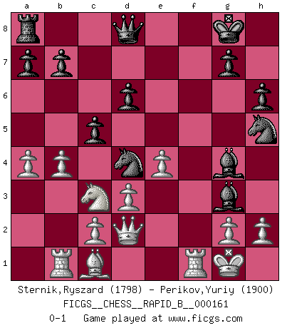 Last move : 0-1 2010 October 12 12:28:23 [Event "FICGS__CHESS__RAPID_B__000161"] [Site "FICGS"] [Date "2010.10.02"] [Round "1"] [White "Sternik,Ryszard"] [Black "Perikov,Yuriy"] [Result "0-1"] [WhiteElo "1798"] [BlackElo "1900"] 1.e4 c5 2.Nc3 d6 3.Nf3 e5 4.Bc4 Be7 5.d3 Nc6 6.O-O Nf6 7.Ng5 O-O 8.f4 Bg4 9.Qe1 h6 10.Nxf7 Rxf7 11.Bxf7+ Kxf7 12.Qg3 Kg8 13.fxe5 Nxe5 14.a4 Nh5 15.Qe3 Bg5 16.Qe1 Bh4 17.Qd2 Nc6 18.Rb1 Nd4 19.b4 Bg3 0-1 Sicilian : Closed Kingside Castling by player White (move 6) Kingside Castling by player Black (move 7) Player Black won this chess game. Follow this game move after move (download)We don't really know how the game was invented, though there are suspicions. As soon as we discover the culprits, we'll let you know. (Bruce Pandolfini) Ich würde die 30 stärksten Spieler der USA im Simultanspiel besiegen. (José Raúl Capablanca) Los libros de Ajedrez deben de usarse igual como usamos los anteojos: para mejorar la vista, aunque algunos jugadores los quieren usar como si ellos les otorgaran la vision. (José Raúl Capablanca) Le temps de noter son nom sur la feuille de partie, j'étais déjà en zeitnot ! D'un modeste amateur apparié lors de la première ronde d'un open contre le grand-maître Azmaïparashvili. Computers have lots of memory but no imagination. (Anonymous)