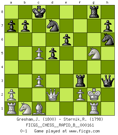 Last move : 0-1 2010 October 22 16:32:7 [Event "FICGS__CHESS__RAPID_B__000161"] [Site "FICGS"] [Date "2010.10.02"] [Round "1"] [White "Gresham,Jonathan"] [Black "Sternik,Ryszard"] [Result "0-1"] [WhiteElo "1800"] [BlackElo "1798"] 1.e4 e6 2.d4 d5 3.e5 c5 4.Nf3 Qb6 5.c3 Bd7 6.Be2 Bb5 7.O-O Bxe2 8.Qxe2 Qa6 9.Qd2 Nd7 10.Qf4 Ne7 11.Ng5 Nf5 12.g4 Nh6 13.h4 f6 14.exf6 gxf6 15.Nh3 O-O-O 16.dxc5 Rg8 17.g5 Bxc5 18.b4 fxg5 19.Nxg5 Rdf8 20.Qd2 Qc4 21.bxc5 Qg4+ 22.Kh1 Rf3 23.Rg1 Qxh4+ 24.Kg2 Qh3+ 0-1 French : Advance, Nimzovich system Kingside Castling by player White (move 7) Queenside Castling by player Black (move 15) Player Black won this chess game. Follow this game move after move (download)If you aren't afraid of Spassky, then I have removed the element of money. (Jim Slater) Schach ist Leben. (Robert James Fischer) Es muy difícil jugar en contra de la teoría de Einstein. - en su primera derrota en contra de Fischer (Mikhail Tal) Vouloir jouer aux échecs contre soi-même est aussi paradoxal que vouloir marcher sur son ombre. (Stefan Zweig) Children in the dark cause accidents, accidents in the dark cause children. (Unknown)