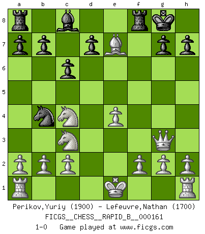 Last move : 1-0 2010 November 16 10:12:9 [Event "FICGS__CHESS__RAPID_B__000161"] [Site "FICGS"] [Date "2010.10.02"] [Round "1"] [White "Perikov,Yuriy"] [Black "Lefeuvre,Nathan"] [Result "1-0"] [WhiteElo "1900"] [BlackElo "1700"] 1.e4 e5 2.Nf3 f6 3.Nc3 c6 4.d4 Bd6 5.dxe5 fxe5 6.Qxd6 Qf6 7.Qc7 Ne7 8.Bg5 Qe6 9.Nxe5 O-O 10.Bc4 Qxc4 11.Nxc4 Na6 12.Qg3 Nb4 13.Bxe7 1-0 This chess game has been lost on time (started : 2010.10.02 1:26:30) Damiano's defense Kingside Castling by player Black (move 9) Player White won this chess game. Follow this game move after move (download)I feel as if I were a piece in a game of Chess, when my opponent says of it: That piece cannot be moved. (Soren Kierkegaard) Das Schach hält seine Meister in eigenen Banden, Fesseln; auf vielerlei Weise formt es ihren Geist, so dass die innere Freiheit selbst des Stärksten beeinflusst wird. (Albert Einstein) Si pudieramos observar el interior de la cabeza de un jugador de Ajedrez, encontraríamos ahí un mundo lleno de sentimientos, imágenes, ideas, emoción y pasión. (Alfred Binet) Pour moi, les échecs ne sont pas un jeu mais un art. (Alexandre Alekhine) There is far too much law for those who can afford it and far too little for those who cannot. (Derek Bok)