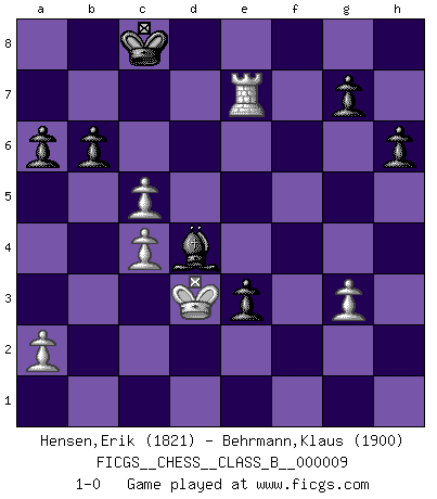 Last move : 1-0 2007 January 22 23:24:54 [Event "FICGS__CHESS__CLASS_B__000009"] [Site "FICGS"] [Date "2006.11.25"] [Round "1"] [White "Hensen,Erik"] [Black "Behrmann,Klaus"] [Result "1-0"] [WhiteElo "1821"] [BlackElo "1900"] 1.e4 c6 2.d4 d5 3.Nc3 dxe4 4.Nxe4 Bf5 5.Ng3 Bg6 6.Nf3 Nd7 7.h4 h6 8.h5 Bh7 9.Bd3 Bxd3 10.Qxd3 e6 11.Bf4 Qa5+ 12.Bd2 Qc7 13.O-O-O Ngf6 14.Ne4 O-O-O 15.g3 Nxe4 16.Qxe4 Nf6 17.Qe2 Bd6 18.c4 Qe7 19.Kb1 Bc7 20.Bc3 Rhg8 21.Ne5 Nd7 22.Nd3 Nb6 23.b3 Qf6 24.Kb2 Qe7 25.Qe3 Kb8 26.Rhe1 Rge8 27.Qf3 Qf8 28.Bb4 Qg8 29.Ne5 f6 30.Ng6 Qf7 31.Bc3 Qd7 32.Rd2 Nc8 33.Rde2 Ne7 34.Nf4 Nf5 35.Nxe6 Rxe6 36.Rxe6 Nxd4 37.Bxd4 Qxd4+ 38.Qc3 Qxf2+ 39.R1e2 Qf5 40.Re8 Qxh5 41.Rxd8+ Bxd8 42.Qe3 Qe5+ 43.Kb1 Qf5+ 44.Qe4 Qd7 45.Kc2 a6 46.Re3 f5 47.Rd3 fxe4 48.Rxd7 Bf6 49.Kd2 Kc8 50.Rf7 Bd4 51.b4 b6 52.Re7 e3+ 53.Kd3 c5 54.bxc5 1-0 Caro-Kann : Classical variation Queenside Castling by player White (move 13) Queenside Castling by player Black (move 14) Player White won this chess game. Follow this game move after move (download)It is difficult to play against Einstein's theory --on his first loss to Fischer. (Mikhail Tal) Ich habe kein Problem mit Frauen, sondern nur mit dem Niveau ihres Schachspiels (Judith Polgar) El juego de Fischer siempre fue nítido, racional y brillante. Uno de los mejores por siempre. (Dave Regis) Le génie consiste à savoir transgresser les règles au moment opportun. (Teichmann) The faster the computer, the slower the brain. (Thibault de Vassal)