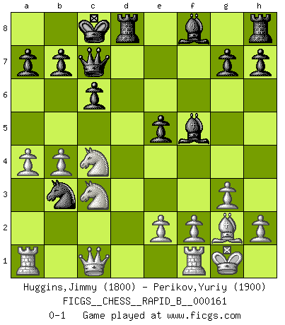 Last move : 0-1 2010 October 16 18:53:54 [Event "FICGS__CHESS__RAPID_B__000161"] [Site "FICGS"] [Date "2010.10.02"] [Round "1"] [White "Huggins,Jimmy"] [Black "Perikov,Yuriy"] [Result "0-1"] [WhiteElo "1800"] [BlackElo "1900"] 1.d4 d5 2.c4 c6 3.Nf3 Nf6 4.Nc3 dxc4 5.a4 Bf5 6.Ne5 Nbd7 7.Nxc4 Qc7 8.g3 e5 9.dxe5 Nxe5 10.Bf4 Nfd7 11.Bg2 f6 12.O-O O-O-O 13.Qc1 Nc5 14.Bxe5 fxe5 15.b4 Nb3 0-1 QGD Slav : Krause attack Kingside Castling by player White (move 12) Queenside Castling by player Black (move 12) Player Black won this chess game. Follow this game move after move (download)I know people who have all the will in the world, but still can't play good Chess. (Bobby Fischer) Wenn Spassky eine Figur opfert kannst du genauso gut aufgeben. Aber wenn Tal eine Figur opfert, spiel weiter. Er könnte noch eine weitere opfern, und dann ... wer weiß? (Miguel Najdorf) El estómago es una parte esencial del maestro de Ajedrez. (Bent Larsen) Votre prénom est 'Tactique', votre deuxième prénom est 'Tactique' et votre nom est 'Tactique'. (Ken Smith) Men should grow up. - Yeah. And dogs should stop licking themselves. It's not gonna happen. (Gregory House to Dr. Cameron, House M.D.)