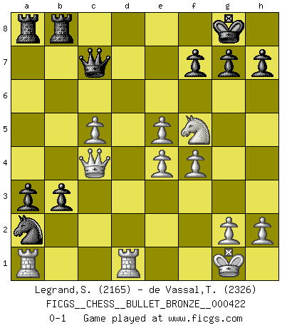 Last move : 0-1 2010 October 3 14:13:57 [Event "FICGS__CHESS__BULLET_BRONZE__000422"] [Site "FICGS"] [Date "2010.10.03"] [Round "1"] [White "Legrand,Stephane"] [Black "de Vassal,Thibault"] [Result "0-1"] [WhiteElo "2165"] [BlackElo "2326"] 1.d4 d5 2.c4 c6 3.Nf3 dxc4 4.e3 b5 5.a4 e6 6.axb5 cxb5 7.b3 Bb4+ 8.Bd2 Bxd2+ 9.Nbxd2 a5 10.bxc4 b4 11.Ne5 Nf6 12.c5 O-O 13.Ndc4 Qc7 14.Nd6 Nc6 15.Nb5 Qb7 16.Nc4 Qe7 17.Ncd6 Nd5 18.e4 Nc7 19.Bd3 Ba6 20.Nxc7 Qxc7 21.Bxa6 Rxa6 22.O-O Rd8 23.Re1 e5 24.Qd3 R6a8 25.dxe5 a4 26.Qd5 Qd7 27.f4 b3 28.Red1 Nb4 29.Qd2 Rdb8 30.Qc3 Qc7 31.Nf5 Na2 32.Qc4 a3 0-1 This chess game has been lost on time (started : 2010.10.03 13:35:36) Comment by player 2 : Thibault de Vassal : Problème de connexion ? La partie était intéressante, mais comme à chaque fois dans cette variante il faut ramer un bon moment avant d'espérer un peu de jeu... Revanche ? QGD Slav : 3.Nf3 Kingside Castling by player Black (move 12) Kingside Castling by player White (move 22) Player Black won this chess game. Follow this game move after move (download)Adequate compensation for a sacrifice is having a sound combination leading to a winning position; adequate compensation for a blunder is having your opponent snatch defeat from the jaws of victory. (Bruce A. Moon) Der Umstand, daß uns eine 7 Stunden Zeitkontrolle ermöglicht eine großartige, tiefe Partie zu spielen, ist für die Massenmedien nicht weiter von Bedeutung. (Alexej Shirov) El Ajedrez es tan inspirador que yo no creo que un buen jugador sea capaz de tener un pensamiento malo durante una partida. (Wilhelm Steinitz) Le joueur d'Echecs qui veut atteindre le top est obligé de développer son propre credo créatif. Alexeï Stepanovicth Souétine. Il est facile d'écrire des livres ! Ce qui est difficile, c'est de jouer ! (Alexeï Stepanovicth Souétine) Watch your thoughts; they become words. Watch your words; they become actions. Watch your actions; they become habits. Watch your habits; they become character. Watch your character; it becomes your destiny. (Frank Outlaw)