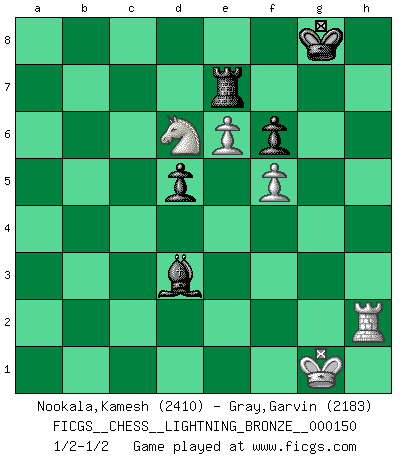 Last move : 1/2-1/2 2010 October 3 17:10:42 [Event "FICGS__CHESS__LIGHTNING_BRONZE__000150"] [Site "FICGS"] [Date "2010.10.03"] [Round "1"] [White "Nookala,Kamesh"] [Black "Gray,Garvin"] [Result "1/2-1/2"] [WhiteElo "2410"] [BlackElo "2183"] 1.e4 e6 2.d4 d5 3.Nc3 Nf6 4.e5 Nfd7 5.f4 c5 6.Nf3 a6 7.Be3 b5 8.Qd2 Nc6 9.a3 Bb7 10.Bd3 Qb6 11.Qf2 cxd4 12.Nxd4 Bc5 13.Nce2 b4 14.c3 a5 15.axb4 axb4 16.Rxa8+ Bxa8 17.O-O O-O 18.Nc1 bxc3 19.bxc3 Na5 20.Bc2 Nc4 21.Nd3 Be7 22.f5 Nxe3 23.Qxe3 exf5 24.Ba4 Nb8 25.Rxf5 Nc6 26.Bxc6 Bxc6 27.e6 f6 28.Rf2 g6 29.g3 Ra8 30.Kg2 Bb7 31.Qf4 Qd8 32.Rb2 Qc8 33.Nf2 Ba6 34.Ng4 Qc4 35.h4 Rf8 36.Nh6+ Kh8 37.h5 Qxc3 38.Rc2 Qe1 39.hxg6 hxg6 40.Nhf5 gxf5 41.Nxf5 Qe4+ 42.Kg1 Qxf4 43.Rh2+ Kg8 44.Nxe7+ Kg7 45.gxf4 Re8 46.Nf5+ Kg6 47.Nd6 Re7 48.Rg2+ Kh7 49.f5 Bd3 50.Rh2+ Kg8 1/2-1/2 French : Steinitz variation Kingside Castling by player White (move 17) Kingside Castling by player Black (move 17) 10 pieces endgame at move 45 : White KRNPP , Black KRBPP WHITE : King + 1 Rook 1 Knight 2 Pawns BLACK : King + 1 Rook 1 Bishop 2 Pawns This chess game ended in a draw. Follow this game move after move (download)You know you're going to lose. Even when I was ahead I knew I was going to lose. - On playing against Fischer. (Andrew Soltis) Warum muß ich gegen diesen IDIOTEN verlieren? (Aaron Nimzowitsch) El tablero es el mundo, las piezas es el fenomeno del universo, las reglas del juego son lo que llamamos leyes de la naturaleza y el jugador del lado opuesto, se encuentra oculto a nuestra vista. (Thomas Huxley) Echiquier : carré parfait, comme la Jérusalem nouvelle décrite par l'auteur de l'Apocalypse, huit cases sur huit, exaltation du chiffre 4, symbole du cosmos aux quatre horizons... où le noir et le blanc, l'ombre et la lumière, le mal et le bien s'entremêlent et se conjuguent. (Robert Couffignal, Le Gambit du poète) All the biggest technological inventions created by man - the airplane, the automobile, the computer - says little about his intelligence, but speaks volumes about his laziness. (Mark Kennedy)
