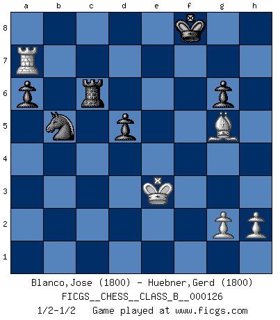 Last move : 1/2-1/2 2011 March 21 21:28:9 [Event "FICGS__CHESS__CLASS_B__000126"] [Site "FICGS"] [Date "2010.10.04"] [Round "1"] [White "Blanco,Jose"] [Black "Huebner,Gerd"] [Result "1/2-1/2"] [WhiteElo "1800"] [BlackElo "1800"] 1.e4 c5 2.Nc3 e6 3.f4 d5 4.Nf3 Nc6 5.Bb5 Nf6 6.e5 Nd7 7.Bxc6 bxc6 8.d3 Be7 9.O-O O-O 10.Re1 Re8 11.Ne2 Ba6 12.Be3 c4 13.Qd2 Rb8 14.Rab1 cxd3 15.cxd3 c5 16.Bf2 c4 17.dxc4 Bxc4 18.Nfd4 Rc8 19.b3 Ba6 20.b4 Nb6 21.Nc1 Qd7 22.Rb3 Bb7 23.f5 exf5 24.Nd3 Na4 25.Qf4 Rc4 26.Qxf5 Bc8 27.Qxd7 Bxd7 28.e6 fxe6 29.Ne5 Rc7 30.Nxd7 Rxd7 31.Rxe6 Rc8 32.Rc6 Rdc7 33.b5 a6 34.Bg3 Rxc6 35.bxc6 Bc5 36.Bf2 Bxd4 37.Bxd4 Rxc6 38.Rb7 g6 39.Rg7+ Kf8 40.Rxh7 Nc3 41.Kf2 Nxa2 42.Ra7 Nb4 43.Be3 Nc2 44.Bg5 Nd4 45.Ke3 Nb5 1/2-1/2 Sicilian : Closed Kingside Castling by player White (move 9) Kingside Castling by player Black (move 9) This chess game ended in a draw. Follow this game move after move (download)One of these modest little moves may be more embarrassing to your opponent than the biggest threat. (Siegbert Tarrasch) Der 70jährige Viktor Kortschnoi: Die Rentenanstalt wollte mich zwingen in Rente zu gehen. Meine Frau erhält jetzt eine Pension- und ich zahle weiter in die Rentenkasse ein! (Viktor Kortschnoi) No es suficiente ser un buen jugador, se debe también de jugar bién. (Siegbert Tarrasch) Toute estimation doit être constamment réévaluée. (Jacob Estrin) Every vice is only an exaggeration of a necessary and virtuous function. (Ralph Waldo Emerson, Journals 1936)