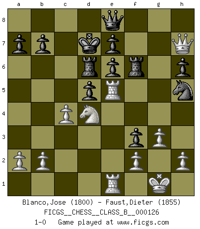 Last move : 1-0 2011 March 1 11:28:13 [Event "FICGS__CHESS__CLASS_B__000126"] [Site "FICGS"] [Date "2010.10.04"] [Round "1"] [White "Blanco,Jose"] [Black "Faust,Dieter"] [Result "1-0"] [WhiteElo "1800"] [BlackElo "1855"] 1.e4 c6 2.d4 d5 3.exd5 cxd5 4.Bd3 Nf6 5.c3 Bg4 6.Qb3 Qd7 7.Bf4 Nc6 8.Nd2 g6 9.Ngf3 Nh5 10.Be3 Bf5 11.Bxf5 gxf5 12.Ne5 Nxe5 13.dxe5 Rg8 14.O-O f4 15.e6 fxe6 16.Qd1 Rg5 17.Nf3 Rf5 18.Bd4 Bg7 19.Re1 Qd6 20.Qe2 Bf6 21.Bxf6 Rxf6 22.Qb5+ Qc6 23.Qd3 h6 24.Ne5 Qa6 25.Qh7 O-O-O 26.Nf3 Qc6 27.Re5 Qe8 28.Rae1 Rd6 29.Nd4 f3 30.g3 Kd7 31.c4 1-0 Caro-Kann : Exchange variation Kingside Castling by player White (move 14) Queenside Castling by player Black (move 25) Player White won this chess game. Follow this game move after move (download)Fischer was a master of clarity and a king of artful positioning. His opponents would see where he was going but were powerless to stop him. (Bruce Pandolfini) Wir irren allesamt, nur jeder irrt anders. (Georg Christoph Lichtenberg) Después de la respuesta de las negras a 1.e4 con 1..e5, se quedan siempre tratando de entrar dentro del juego. (Howard Staunton) Votre prénom est 'Tactique', votre deuxième prénom est 'Tactique' et votre nom est 'Tactique'. (Ken Smith) The Internet is the first thing that humanity has build that humanity doesn't understand, the largest experiment in anarchy that we have ever had. (Eric Schmidt)