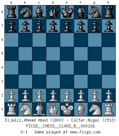 Last move : 0-1 2010 November 13 10:7:40 [Event "FICGS__CHESS__CLASS_B__000126"] [Site "FICGS"] [Date "2010.10.04"] [Round "1"] [White "Eljalil,Ahmad Abed"] [Black "Colter,Nigel"] [Result "0-1"] [WhiteElo "1800"] [BlackElo "1912"] 0-1 This chess game has been lost on time (started : 2010.10.04 0:44:12) Player Black won this chess game. Follow this game move after move (download)The hallmark of the artist is simplicity. (Larry Evans) Dieses schreckliche Gefühl, dass ich gegen eine Maschine spielte, die niemals Fehler macht, zerschmetterte meinen Widerstand. (Mark Taimanov) No solamente yo pronostico su triunfo sobre Botvinnik, sino que me adelanto y digo que probablemente Fischer es el jugador de Ajedrez mas grande que haya existido. (John Collins) Le jeu d'échecs fait naître et fortifie en nous plusieurs qualités précieuses dans le cours de l'existence, telles que la prévoyance, la circonspection, la prudence, et la persévérance. (Benjamin Franklin - 1783, la morale des échecs) Only sick music makes money today. (Friedrich Nietzsche)