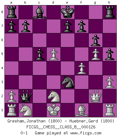 Last move : 0-1 2010 October 10 21:30:9 [Event "FICGS__CHESS__CLASS_B__000126"] [Site "FICGS"] [Date "2010.10.04"] [Round "1"] [White "Gresham,Jonathan"] [Black "Huebner,Gerd"] [Result "0-1"] [WhiteElo "1800"] [BlackElo "1800"] 1.f4 d5 2.Nf3 g6 3.e3 Bg7 4.h3 Nf6 5.g4 c5 6.Qe2 h5 7.g5 Ne4 8.Qg2 Nc6 9.d3 Qb6 10.dxe4 Bxb2 11.Bxb2 Qxb2 12.Nfd2 Nb4 13.exd5 Nxc2+ 14.Kd1 Nxe3+ 0-1 Bird's Opening Player Black won this chess game. Follow this game move after move (download)If I win a tournament, I win it by myself. I do the playing. Nobody helps me. (Bobby Fischer) Alle offensichtlichen Züge sehen nach dem Spiel in der Analyse verdächtig aus. (Viktor Kortschnoi) Morphy probablemente fue el genio más grande de todos. (Bobby Fischer) Le joueur d'Echecs qui veut atteindre le top est obligé de développer son propre credo créatif. Alexeï Stepanovicth Souétine. Il est facile d'écrire des livres ! Ce qui est difficile, c'est de jouer ! (Alexeï Stepanovicth Souétine) Whatever you do, don't be bored. This is absolutely the most exciting time we could have possibly hoped to be alive. And things are just starting. (From movie Waking life)