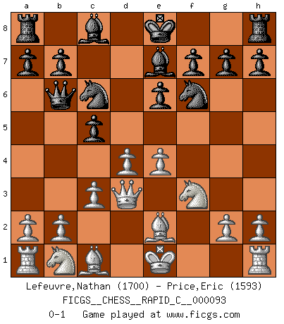 Last move : 0-1 2010 November 20 22:35:47 [Event "FICGS__CHESS__RAPID_C__000093"] [Site "FICGS"] [Date "2010.10.04"] [Round "1"] [White "Lefeuvre,Nathan"] [Black "Price,Eric"] [Result "0-1"] [WhiteElo "1700"] [BlackElo "1593"] 1.d4 Nf6 2.f3 d5 3.c3 e6 4.Qd3 c5 5.e4 dxe4 6.fxe4 Nc6 7.Nf3 Qb6 8.Be2 Be7 0-1 This chess game has been lost on time (started : 2010.10.04 15:13:27) Paleface attack Player Black won this chess game. Follow this game move after move (download)The beauty of a move lies not in its' appearance but in the thought behind it. (Siegbert Tarrasch) Es ist peinlich, dass ich nie Weltmeister wurde. Es wäre leicht, Leonid Breschnjew als Ursache vorzuschieben, dessen Apparat den Vorzeigekommunisten Anatoli Karpow in allem unterstützte. Aber Garri Kasparow zum Beispiel, der ebenfalls von den Sowjets unerwünscht war, hat trotz der Widerstände den WM-Titel erobert. (Viktor Kortschnoi) Si no le temes a Spassky, entonces elimino el elemento del dinero. (Jim Slater) Seul un grand joueur sait à quel point il joue faiblement. (Xavier Tartacover) Being number two sucks. (Andre Agassi)