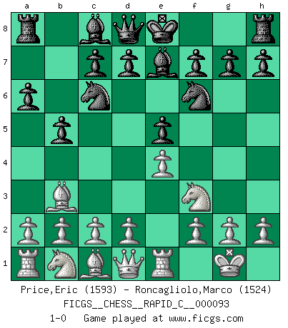 Last move : 1-0 2010 November 14 10:6:55 [Event "FICGS__CHESS__RAPID_C__000093"] [Site "FICGS"] [Date "2010.10.04"] [Round "1"] [White "Price,Eric"] [Black "Roncagliolo,Marco"] [Result "1-0"] [WhiteElo "1593"] [BlackElo "1524"] 1.e4 e5 2.Nf3 Nc6 3.Bb5 a6 4.Ba4 Nf6 5.O-O Be7 6.Re1 b5 7.Bb3 1-0 This chess game has been lost on time (started : 2010.10.04 15:13:27) Ruy Lopez : Closed Kingside Castling by player White (move 5) Player White won this chess game. Follow this game move after move (download)Only the player with the initiative has the right to attack. (Wilhelm Steinitz) Das Schachspiel übertrifft alle anderen Spiele so weit wie der Chimborasso einen Misthaufen. (Arthur Schopenhauer) Un sacrificio se refuta mucho mejor al aceptarlo. (Wilhelm Steinitz) Les Echecs ont trois composantes : le temps, l'espace et le matériel en dernier. (Mikhail Tal) Even the best needles are not sharp at both ends. (Chinese proverb)