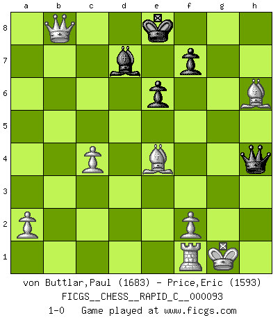 Last move : 1-0 2010 October 14 23:2:48 [Event "FICGS__CHESS__RAPID_C__000093"] [Site "FICGS"] [Date "2010.10.04"] [Round "1"] [White "von Buttlar,Paul"] [Black "Price,Eric"] [Result "1-0"] [WhiteElo "1683"] [BlackElo "1593"] 1.c4 Nf6 2.Nc3 e6 3.e4 d5 4.e5 d4 5.exf6 dxc3 6.bxc3 Qxf6 7.d4 c5 8.Nf3 h6 9.Bd3 Nc6 10.O-O Bd6 11.Rb1 cxd4 12.cxd4 Nxd4 13.Nxd4 Qxd4 14.Bb2 Qh4 15.g3 Qe7 16.Bxg7 Rg8 17.Bxh6 b6 18.Be4 Rb8 19.Qa4+ Bd7 20.Qxa7 Qh4 21.Rxb6 Rxg3+ 22.hxg3 Bxg3 23.Rxb8+ Bxb8 24.Qxb8+ 1-0 English : Mikenas-Carls, Flohr variation Kingside Castling by player White (move 10) Player White won this chess game. Follow this game move after move (download)Every Pawn is a potential Queen. (James Mason) Der Traum, für den ich lebe, ist der von einem freien Russland. Viele mögen sagen: Russland hat doch ein Parlament, einen gewählten Präsidenten. Aber ich spüre, dass in meiner Heimat die Angst wiederkehrt. Eine Angst, sich frei zu äußern, bestimmte Dinge zu tun (Garry Kasparov) El Ajedrez es como la guerra en un tablero. (Bobby Fischer) Vouloir jouer aux échecs contre soi-même est aussi paradoxal que vouloir marcher sur son ombre. (Stefan Zweig) Just because you do not take an interest in politics doesn't mean politics won't take an interest in you. (Pericles 430 B.C.)