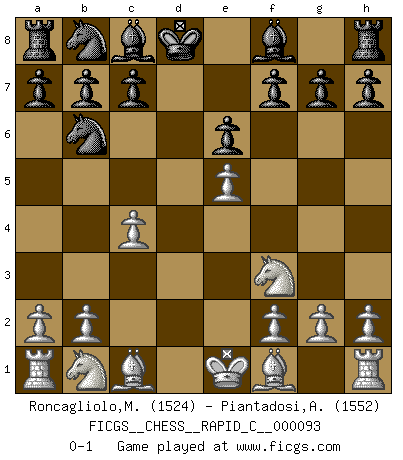 Last move : 0-1 2010 November 14 22:8:28 [Event "FICGS__CHESS__RAPID_C__000093"] [Site "FICGS"] [Date "2010.10.04"] [Round "1"] [White "Roncagliolo,Marco"] [Black "Piantadosi,Angelo"] [Result "0-1"] [WhiteElo "1524"] [BlackElo "1552"] 1.e4 Nf6 2.e5 Nd5 3.d4 d6 4.Nf3 dxe5 5.dxe5 e6 6.c4 Nb6 7.Qxd8+ Kxd8 0-1 This chess game has been lost on time (started : 2010.10.04 15:13:27) Alekhine's defense : Modern, Larsen variation Player Black won this chess game. Follow this game move after move (download)By this measure (on the gap between Fischer & his contemporaries), I consider him the greatest world champion. (Garry Kasparov) Wir können eben der zündenden Macht des Opfers nicht wiederstehen, denn die Begeisterung für das Opfer liegt in der Natur des Menschen. (Rudolf Spielmann) El Ajedrez es un juego terrible. Si no dominas el centro, tu oponente tiene una posición mas libre. Si tu tienes el centro, entonces realmente tienes algo de que preocuparte. (Siegbert Tarrasch) Toute estimation doit être constamment réévaluée. (Jacob Estrin) All the troubles of the world come from being unable to sit alone in a quiet room. (Blaise Pascal)