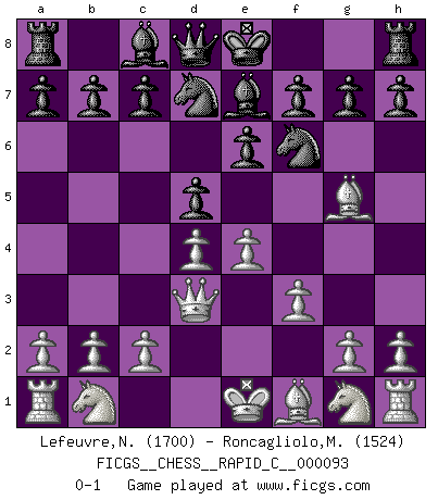 Last move : 0-1 2010 November 29 22:18:33 [Event "FICGS__CHESS__RAPID_C__000093"] [Site "FICGS"] [Date "2010.10.04"] [Round "1"] [White "Lefeuvre,Nathan"] [Black "Roncagliolo,Marco"] [Result "0-1"] [WhiteElo "1700"] [BlackElo "1524"] 1.d4 Nf6 2.f3 d5 3.Bg5 Nbd7 4.Qd3 e6 5.e4 Be7 0-1 This chess game has been lost on time (started : 2010.10.04 15:13:27) Paleface attack Player Black won this chess game. Follow this game move after move (download)Chess is life. (Bobby Fischer) Stil? Ich habe keinen Stil! (Anatoly Karpov) Si yo gano un torneo, yo lo gano por mí mismo. Yo hago las jugadas. Nadie me ayuda. (Bobby Fischer) La victoire dans une partie d'Echecs appartient la plupart du temps à celui qui voit un peu plus loin que l'adversaire. (Lasker) Logic : The art of thinking and reasoning in strict accordance with the limitations and incapacities of the human misunderstanding. (Ambrose Bierce)