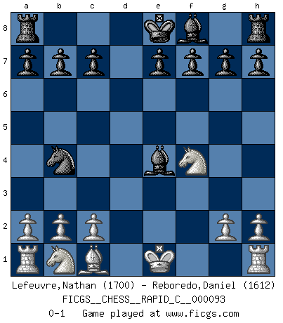 Last move : 0-1 2010 November 18 10:17:5 [Event "FICGS__CHESS__RAPID_C__000093"] [Site "FICGS"] [Date "2010.10.04"] [Round "1"] [White "Lefeuvre,Nathan"] [Black "Reboredo,Daniel"] [Result "0-1"] [WhiteElo "1700"] [BlackElo "1612"] 1.d4 Nf6 2.f3 d5 3.Qd3 Nc6 4.e4 dxe4 5.fxe4 Qxd4 6.Ne2 Qxe4 7.Qxe4 Nxe4 8.Nf4 Bf5 9.Bd3 Nb4 10.Bxe4 Bxe4 0-1 This chess game has been lost on time (started : 2010.10.04 15:13:27) Paleface attack Player Black won this chess game. Follow this game move after move (download)Chess teaches you to control the initial excitement you feel when you see something that looks good and it trains you to think objectively when you're in trouble. (Stanley Kubrick) Um sich vor der Gefahr einer Erkältung zu schützen, sorge der wanderlustige König beizeiten für ein brauchbares Versteck. (Aaron Nimzowitsch) Desconfianza es la característica mas necesaria de un jugador de Ajedrez. (Siegbert Tarrasch) L'action d'une oeuvre littéraire se déroule sur un champ de bataille. Les masques et les types du drame moderne correspondent aux pièces du jeu d'échecs. L'intrigue correspond aux coups et aux gambits, c'est à dire aux techniques du jeu telles qu'utilisées et interprétées par les joueurs. Les tactiques et les péripéties [mouvements] correspondent aux coups exécutés par l'adversaire. (Viktor Shklovsky) A proverb is a short sentence based on long experience. (Miguel de Cervantes)