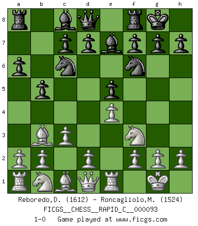 Last move : 1-0 2010 November 12 10:4:1 [Event "FICGS__CHESS__RAPID_C__000093"] [Site "FICGS"] [Date "2010.10.04"] [Round "1"] [White "Reboredo,Daniel"] [Black "Roncagliolo,Marco"] [Result "1-0"] [WhiteElo "1612"] [BlackElo "1524"] 1.e4 e5 2.Nf3 Nc6 3.Bb5 a6 4.Ba4 Nf6 5.O-O Be7 6.Re1 b5 7.Bb3 O-O 8.c3 1-0 This chess game has been lost on time (started : 2010.10.04 15:13:27) Ruy Lopez : Closed, 7...O-O Kingside Castling by player White (move 5) Kingside Castling by player Black (move 7) Player White won this chess game. Follow this game move after move (download)You can only get good at Chess if you love the game. (Bobby Fischer) Computer sind die einzigen Gegner, die nicht immer eine Ausrede auf Lager haben, wenn sie gegen mich verlieren. (Robert James Fischer) Fischer es el jugador mas fuerte del mundo. De hecho, el jugador mas fuerte que jamas haya existido. (Larry Evans) Que feriez-vous si vous étiez en train de jouer aux échecs et que la fin du monde arrive ? Je continuerais à jouer. (Saint Borromée) Statistics can be made to prove anything - even the truth. (Author unknown)