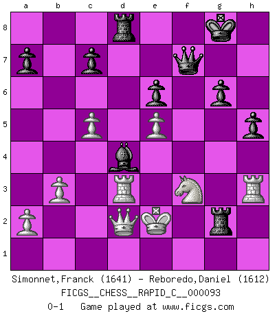Last move : 0-1 2010 November 17 18:13:27 [Event "FICGS__CHESS__RAPID_C__000093"] [Site "FICGS"] [Date "2010.10.04"] [Round "1"] [White "Simonnet,Franck"] [Black "Reboredo,Daniel"] [Result "0-1"] [WhiteElo "1641"] [BlackElo "1612"] 1.d4 Nf6 2.c4 g6 3.Nc3 d5 4.Qb3 dxc4 5.Qxc4 Bg7 6.e4 O-O 7.Be2 Nfd7 8.Be3 Nb6 9.Qc5 f5 10.e5 f4 11.Bd2 Nc6 12.Nf3 Bg4 13.Ng5 Qd7 14.h3 Bf5 15.Nf3 e6 16.Bxf4 Bxh3 17.Rxh3 Rxf4 18.Bb5 Bf8 19.Bxc6 bxc6 20.Qa5 c5 21.Ne2 Rg4 22.dxc5 Rd8 23.b3 Nd5 24.Rd1 Rxg2 25.Rd4 h5 26.Rd2 Qf7 27.Ned4 Rg4 28.Kf1 Bh6 29.Rd1 Ne3+ 30.fxe3 Bxe3 31.Rd3 Bxd4 32.Qd2 Rg1+ 33.Ke2 Rg2+ 0-1 King's Indian defense, 3.Nc3 Kingside Castling by player Black (move 6) Player Black won this chess game. Follow this game move after move (download)Some sacrifices are sound; the rest are mine. (Mikhail Tal) Im Hotelzimmer gab es nur zwei Schaben. (Über die Turnierbedingungen) (Peter Swidler) Una de estas pequeñas movidas modestas pudieran ser mas molestas a tu oponente que la amenaza mas grande. (Siegbert Tarrasch) Il a essayé de se convaincre qu'il pourrait empêcher toutes les erreurs et ne jamais perdre. L'horreur ! Gary Kasparov au sujet de Robert Fischer. Wisdom begins at the end. (Daniel Webster)