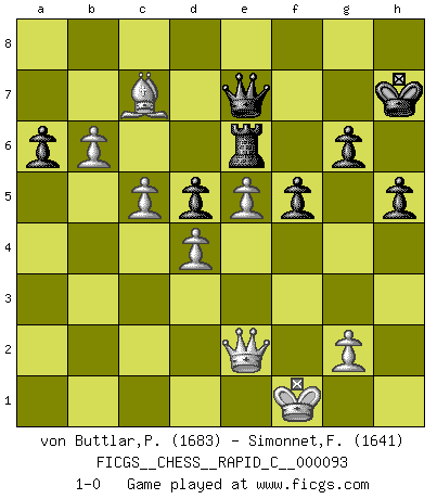 Last move : 1-0 2010 December 31 15:20:22 [Event "FICGS__CHESS__RAPID_C__000093"] [Site "FICGS"] [Date "2010.10.04"] [Round "1"] [White "von Buttlar,Paul"] [Black "Simonnet,Franck"] [Result "1-0"] [WhiteElo "1683"] [BlackElo "1641"] 1.c4 e5 2.Nc3 Nf6 3.Nf3 Nc6 4.e3 Bb4 5.Qc2 O-O 6.d3 d5 7.cxd5 Nxd5 8.Be2 Be6 9.O-O f5 10.Bd2 Qe7 11.a3 Bd6 12.Nb5 a6 13.Nxd6 cxd6 14.Rac1 Rac8 15.Qb1 Qf6 16.b4 b5 17.h3 Qg6 18.Nh4 Qh6 19.Nf3 Rc7 20.h4 Nde7 21.Bd1 Rfc8 22.Ng5 Bd5 23.Bb3 Bxb3 24.Qxb3+ d5 25.Rc5 Na5 26.Qb2 Rxc5 27.bxc5 Nac6 28.f4 Qxh4 29.Nf3 Qg4 30.Nxe5 Qe2 31.Re1 Qh5 32.Nf3 Qg6 33.Rc1 Qe6 34.Ng5 Qg6 35.Kf2 h6 36.Nf3 Qh5 37.Qa1 Qf7 38.Qa2 Ng6 39.Rb1 Re8 40.a4 b4 41.Bxb4 Rxe3 42.Bd2 Re6 43.Rb6 Kh7 44.a5 Nf8 45.d4 Nd7 46.Ne5 Ncxe5 47.fxe5 Nxb6 48.axb6 Qb7 49.Qc2 g6 50.Qc1 h5 51.Bg5 Qd7 52.Qb2 Re8 53.Qa2 Qb7 54.Qe2 Re6 55.Bd8 Qd7 56.Bc7 Qe7 57.Kf1 1-0 English Opening Kingside Castling by player Black (move 5) Kingside Castling by player White (move 9) Player White won this chess game. Follow this game move after move (download)Chess is the art of analysis. (Mikhail Botvinnik) Wenn ein Kopf und ein Buch zusammenstoßen und es klingt hohl, ist es denn allemal im Buche? (Georg Christoph Lichtenberg) Prefiero perder una partida realmente buena, que ganar una mala. (David Levy) Toutes les manuvres exécutées sur une colonne ouverte ont pour but ultime l'intrusion définitive sur la septième ou la huitième rangée, en plein cur de la position ennemie. (Aaron Nimzovitch) Lamb in skin of tiger, still fears the wolf. (Chinese proverb)