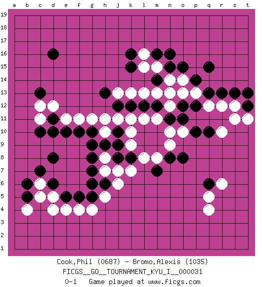 Last move : 0-1 2011 April 15 3:46:42 [Event "FICGS__GO__TOURNAMENT_KYU_I__000031"] [Site "FICGS"] [Date "2010.10.04"] [Round "1"] [Black "Cook,Phil"] [White "Bromo,Alexis"] [Result "0-1"] [Rating 1 "0687"] [Rating 2 "1035"] 1.q15 d4 2.d8 q4 3.q6 q5 4.d16 k10 5.k8 j7 6.j8 h8 7.h9 h10 8.j10 j11 9.j9 k7 10.g8 h7 11.g10 h11 12.g7 l8 13.m7 m8 14.q10 o13 15.n16 m15 16.m16 l16 17.n15 n14 18.p14 o14 19.o15 p13 20.q13 q12 21.r13 r12 22.s13 s12 23.t12 t11 24.t13 s11 25.k16 l15 26.h6 j6 27.g5 h5 28.g6 g4 29.f5 f4 30.e5 d5 31.d6 c6 32.c7 g11 33.f10 f11 34.e10 e11 35.d11 d12 36.c10 c11 37.d10 e4 38.c13 c12 39.k12 j13 40.j12 k9 41.g9 k11 42.l12 l11 43.m12 m11 44.n11 n10 45.o11 o10 46.p10 r10 47.p12 n12 48.o12 n13 49.k15 k13 50.m14 m13 51.h13 l13 52.n8 n9 53.o8 r6 54.b6 c5 55.b5 b4 0-1 This go game has been lost on time (started : 2010.10.04 21:21:50) Here are the names of the openings (joseki) played in the four corners : Corner d4 : d4 d8 Hoshi (Hwajeom, Seongjeom, Xingwei`) 4-4 Point. The star or hoshi (4-4) point, emphasizing influence at the potential expense of territory. Corner q4 : q4 q6 Hoshi (Hwajeom, Seongjeom, Xingwei`) 4-4 Point. The star or hoshi (4-4) point, emphasizing influence at the potential expense of territory. Ikken Takagakari (Hankan Nop'dakeolch'im, Yi Gaojia, 1-Space High Approach). White typically responds at 6-4 or 3-10. White 4-10 is played when White finds play on the right side advantageous. White 4-8 or 3-8 may be played when White has support at top. Corner d16 : d16 j11 Hoshi (Hwajeom, Seongjeom, Xingwei`) 4-4 Point. The star or hoshi (4-4) point, emphasizing influence at the potential expense of territory. Corner q16 : q15 o13 Takamoku (Gomok, Gaomu`) 5-4 Point. The takamoku (high) point (5-4). With its emphasis on influence, the 5-4 point complements the 4-4 (hoshi) point in creating an influence-oriented fuseki. Player White won this Go (weiqi, baduk) game. Follow this game move after move (download)Extend one hand from the cutting points. (Anonymous) Art is the triumph over chaos. (John Cheever)