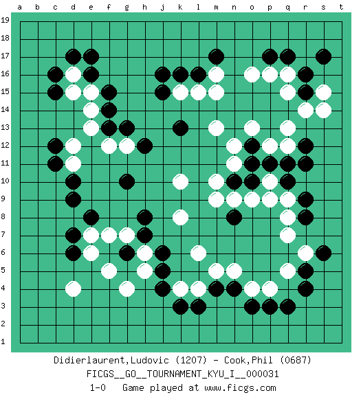 Last move : 1-0 2011 March 29 1:51:26 [Event "FICGS__GO__TOURNAMENT_KYU_I__000031 "] [Site "FICGS"] [Date "2010.10.04"] [Round "1"] [Black "Didierlaurent,Ludovic "] [White "Cook,Phil "] [Result "1-0"] [Rating 1 "1207"] [Rating 2 "0687"] 1.q3 q5 2.r4 p4 3.d17 d16 4.e17 d4 5.q17 q15 6.r16 q16 7.r15 q13 8.d10 d12 9.e16 d15 10.j16 o16 11.d7 g4 12.q10 e7 13.d6 e6 14.k3 k4 15.l3 l4 16.m4 m5 17.n4 n5 18.p3 o4 19.o3 q9 20.r9 q8 21.r8 q7 22.o10 p10 23.p11 p9 24.r11 r14 25.o12 o13 26.m17 m16 27.l16 m15 28.n8 o9 29.n10 n9 30.p17 p16 31.d9 m9 32.k13 k10 33.c16 n12 34.g10 p12 35.o11 m13 36.h8 k8 37.g6 f5 38.e8 g7 39.h7 f7 40.j6 l6 41.f13 f12 42.g13 g12 43.h12 e13 44.j4 h5 45.j5 h6 46.c15 e15 47.f15 e14 48.f14 l15 49.k16 k15 50.j15 m10 51.c12 d11 52.c11 n11 53.q11 q12 54.r12 s14 55.s17 s15 56.r5 r6 57.s6 1-0 This go game has been lost on time (started : 2010.10.04 21:21:50) Here are the names of the openings (joseki) played in the four corners : Corner q4 : q3 q5Komoku (Somok, Xiao~mu`) 3-4 Point. The komoku (3-4) point is the traditional corner enclosure move..Ikken Takagakari (Hankan Nop'dakeolch'im, Yi Gaogua`jiao~, 1-Space High Approach). The 5-4 approach move has become more popular in modern times, as modern Go emphasizes speed and influence. Corner d16 : d17 d16Komoku (Somok, Xiao~mu`) 3-4 Point. The komoku (3-4) point is the traditional corner enclosure move.. Corner q16 : q17 q15Komoku (Somok, Xiao~mu`) 3-4 Point. The komoku (3-4) point is the traditional corner enclosure move..Ikken Takagakari (Hankan Nop'dakeolch'im, Yi Gaogua`jiao~, 1-Space High Approach). The 5-4 approach move has become more popular in modern times, as modern Go emphasizes speed and influence. Corner d4 : d4 d7Hoshi (Hwajeom, Seongjeom, Xingwei`) 4-4 Point. The star or hoshi (4-4) point, emphasizing influence at the potential expense of territory.Niken Takagakari (Dukan Nop'dakeolch'im, E`r Gaojia, 2-Space High Approach). Black 2 is a light approach move. Rarely played in even games, Black 2 is typically employed in handicap games. White continues with 6-4 or 3-10. In Korean Sunjang Baduk White has a stone on 8-4. Player Black won this Go (weiqi, baduk) game.Follow this game move after move (download ) The nature of a game comes from what is played, but it's the sensitivity to the possible and the impossible that gives it value. (Pierre Audouard) Gambling : The sure way of getting nothing from something. (Wilson Mizner)