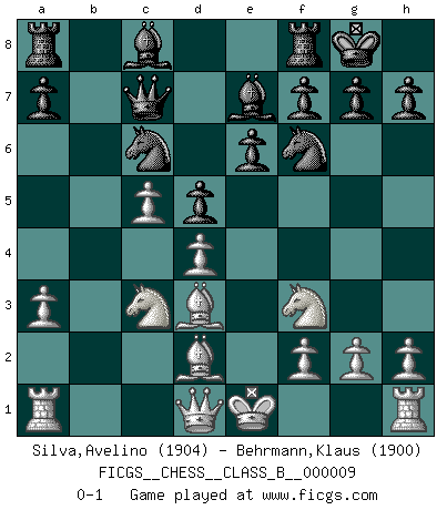 Last move : 0-1 2007 February 1 14:17:39 [Event "FICGS__CHESS__CLASS_B__000009"] [Site "FICGS"] [Date "2006.11.25"] [Round "1"] [White "Silva,Avelino"] [Black "Behrmann,Klaus"] [Result "0-1"] [WhiteElo "1904"] [BlackElo "1900"] 1.e4 c6 2.d4 d5 3.exd5 cxd5 4.c4 Nf6 5.Nc3 e6 6.Nf3 Bd6 7.c5 Be7 8.Bf4 O-O 9.Bd3 Nc6 10.a3 b6 11.b4 bxc5 12.bxc5 Qa5 13.Bd2 Qc7 0-1 Caro-Kann : Panov-Botvinnik attack, 5...e6 Kingside Castling by player Black (move 8) Player Black won this chess game. Follow this game move after move (download)When the Chess game is over, the Pawn and the King go back to the same box. (Irish saying) Ivan Sokolov treibt mich als Beifahrer an mit go Loeky go - . (Loek van Wely) Un entendimiento a fondo de las continuaciones típicas del mate, hace de las combinaciones de sacrificio mas complicadas conducirlas a ellas no solo sin dificultad, sino casi de una manera natural. (Siegbert Tarrasch) Soyez une menace à chaque fois que vous vous asseyez pour jouer. (Ken Smith) Life is like a game of cards: the hand you are dealt represents determinism; the way you play it is free will. (Jawaharlal Nehru)