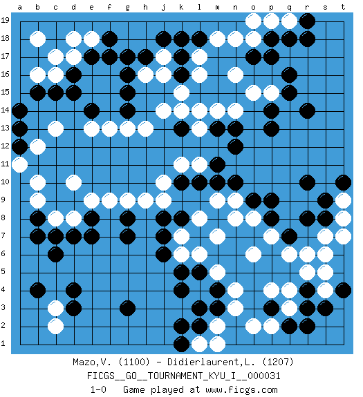 Last move : 1-0 2010 December 27 11:22:46 [Event "FICGS__GO__TOURNAMENT_KYU_I__000031"] [Site "FICGS"] [Date "2010.10.04"] [Round "1"] [Black "Mazo,Vasiliy"] [White "Didierlaurent,Ludovic"] [Result "1-0"] [Rating 1 "1100"] [Rating 2 "1207"] 1.q16 d17 2.d4 q3 3.d15 c16 4.c15 r6 5.k4 d10 6.e17 e18 7.f17 c13 8.c6 c8 9.r14 n3 10.k16 n16 11.p17 n14 12.d16 c17 13.r10 l17 14.k17 n18 15.g3 m5 16.r8 f13 17.g15 h13 18.f18 d18 19.e7 o6 20.p8 f9 21.g7 h9 22.j7 l8 23.k13 l16 24.k18 j14 25.r4 q4 26.r3 r5 27.q2 p2 28.r2 k14 29.n12 s4 30.s3 s6 31.t4 s5 32.p3 p4 33.b15 b16 34.p13 l13 35.m11 l11 36.a12 b10 37.l3 q19 38.q18 p19 39.r18 b12 40.a14 b18 41.b7 n8 42.o9 n9 43.n10 k6 44.j6 k7 45.j8 j9 46.l10 k11 47.k10 j10 48.m13 l14 49.l18 p15 50.q15 o8 51.p9 t9 52.s9 t8 53.t10 s7 54.s8 t7 55.k5 m18 56.r19 o18 57.p18 o19 58.p14 o15 59.b8 j16 60.h17 j17 61.j18 c3 62.d3 c2 63.b4 h16 64.g17 m2 65.l2 a11 66.a13 l1 67.k1 m1 68.k2 m9 69.m10 p7 70.m3 o2 71.l5 l6 72.m4 n4 73.k8 m7 74.g16 k15 75.e8 e9 76.c7 d8 77.d7 b9 78.q7 q6 79.n13 m14 80.e14 e13 81.g14 g13 82.g8 g9 83.o17 1-0 Here are the names of the openings (joseki) played in the four corners : Corner d16 : d17 d15 Komoku (Somok, Xiao~mu`) 3-4 Point. The komoku (3-4) point is the traditional corner enclosure move.. Ikken Takagakari (Hankan Nop'dakeolch'im, Yi Gaogua`jiao~, 1-Space High Approach). The 5-4 approach move has become more popular in modern times, as modern Go emphasizes speed and influence. Player Black won this Go (weiqi, baduk) game. Follow this game move after move (download)Avoid the plate connection. (Anonymous) The real voyage of discovery consists not in seeking new lands but in seeing with new eyes. (Marcel Proust)