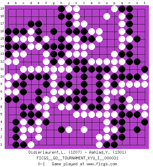 Last move : 0-1 2011 July 15 20:22:38 [Event "FICGS__GO__TOURNAMENT_KYU_I__000031"] [Site "FICGS"] [Date "2010.10.04"] [Round "1"] [Black "Didierlaurent,Ludovic"] [White "Aahlad,Yeturu"] [Result "0-1"] [Rating 1 "1207"] [Rating 2 "1301"] 1.q3 q16 2.d17 c4 3.r5 e3 4.c14 c11 5.q10 l3 6.k16 k10 7.q13 n16 8.c8 e11 9.e8 g8 10.d10 d11 11.d6 f6 12.c5 d5 13.c6 b8 14.b9 b10 15.c9 a9 16.b7 a8 17.a7 a10 18.c10 b12 19.b4 c3 20.b3 e4 21.g16 o3 22.q7 o6 23.h3 j3 24.e5 f5 25.d4 d3 26.n8 o8 27.n9 o9 28.n10 o10 29.n11 q9 30.r10 r9 31.k8 k9 32.l8 l6 33.r17 q17 34.r16 q14 35.r13 p13 36.l12 m12 37.l11 n12 38.m11 m14 39.b14 k14 40.r14 q15 41.o11 p11 42.j12 h14 43.h9 j8 44.j9 h11 45.j10 j11 46.k11 h8 47.l9 g9 48.l10 k17 49.j17 l17 50.j18 r15 51.s15 q12 52.r12 o12 53.k7 j6 54.k6 k5 55.j7 h6 56.f14 s9 57.s10 r6 58.q6 r7 59.q4 s6 60.s5 k18 61.p10 q8 62.h13 j13 63.g13 h12 64.k12 g10 65.p2 o2 66.o1 n1 67.p1 n2 68.b2 c2 69.r18 q18 70.q19 p19 71.r19 o18 72.n7 o7 73.n6 n5 74.p9 p5 75.q5 p8 76.g12 g11 77.e10 f12 78.f10 f13 79.g14 f11 80.h15 e14 81.e15 f15 82.j14 d15 83.e16 d14 84.c16 j19 85.h19 k19 86.h18 t5 87.t4 t6 88.s3 t10 89.t11 t9 90.s12 p3 91.q2 k15 92.j16 b13 93.l16 m16 94.l15 l14 95.m15 a14 96.a15 b15 97.a13 c15 98.b16 c13 99.a14 a12 100.a16 n15 101.p4 o4 102.q11 p12 103.m6 m5 104.c1 d1 105.b1 e6 106.d5 d16 107.e17 k13 108.l7 l5 109.e7 j15 110.h14 l13 111.h7 g7 112.p6 o5 113.f9 f7 114.f4 e2 0-1 This go game has been lost on time (started : 2010.10.04 21:21:50) Here are the names of the openings (joseki) played in the four corners : Corner q16 : q16 q13 Hoshi (Hwajeom, Seongjeom, Xingwei`) 4-4 Point. The star or hoshi (4-4) point, emphasizing influence at the potential expense of territory. Niken Takagakari (Dukan Nop'dakeolch'im, E`r Gaojia, 2-Space High Approach). Black 2 is a light approach move. Rarely played in even games, Black 2 is typically employed in handicap games. White continues with 6-4 or 3-10. In Korean Sunjang Baduk White has a stone on 8-4. Player White won this Go (weiqi, baduk) game. Follow this game move after move (download)If you lose by one point, take a rest. (Anonymous) Internet: Absolute communication, absolute isolation. (Paul Carvel)