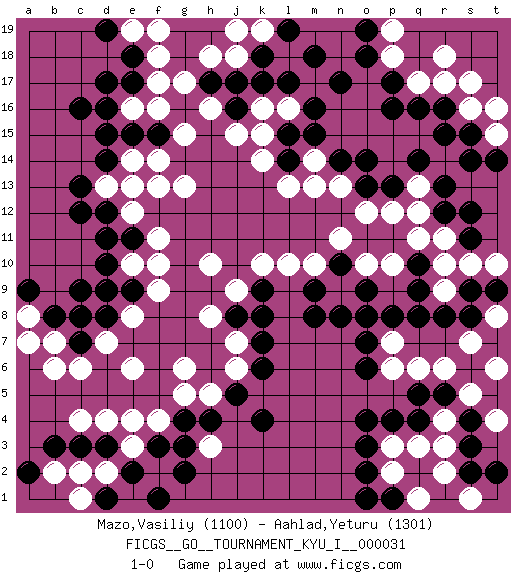 Last move : 1-0 2011 April 20 23:24:19 [Event "FICGS__GO__TOURNAMENT_KYU_I__000031"] [Site "FICGS"] [Date "2010.10.04"] [Round "1"] [Black "Mazo,Vasiliy"] [White "Aahlad,Yeturu"] [Result "1-0"] [Rating 1 "1100"] [Rating 2 "1301"] 1.q16 d4 2.c16 r4 3.d10 e16 4.e17 f17 5.d17 f16 6.c13 k16 7.p4 p3 8.o3 q3 9.o4 r6 10.k4 r14 11.r12 r17 12.r16 q17 13.p16 s16 14.s15 s17 15.r15 r10 16.p17 p18 17.o18 p19 18.o19 r18 19.n17 h3 20.c3 c4 21.d3 e3 22.e2 f2 23.f3 e4 24.g2 d2 25.f1 c2 26.g4 c8 27.c9 e8 28.r8 r9 29.q8 p10 30.o8 q13 31.s14 q12 32.r13 k10 33.e13 g13 34.k8 m10 35.m8 h5 36.h4 g6 37.b8 b7 38.c7 c6 39.d8 d7 40.c8 e6 41.j5 j6 42.k6 j7 43.k7 j9 44.j8 h8 45.m15 k14 46.k18 m14 47.l15 k15 48.l17 f10 49.e11 f11 50.l14 l13 51.n14 p6 52.o6 m13 53.k9 h10 54.o2 p2 55.p1 q1 56.o1 h18 57.q4 r3 58.q5 q6 59.r5 s5 60.s6 s7 61.s4 t6 62.s3 r2 63.s8 p7 64.p8 f18 65.e18 n13 66.o14 r11 67.q14 f13 68.d14 n9 69.n8 b6 70.j17 j18 71.k17 h16 72.o13 o12 73.o7 f4 74.g3 g5 75.e9 f9 76.p13 p12 77.o9 o10 78.m9 l10 79.n10 n11 80.d16 e14 81.e15 e12 82.d12 d13 83.c12 e10 84.d11 e13 85.f15 g15 86.j16 j15 87.h17 g17 88.s11 s10 89.s12 t8 90.t9 t10 91.s9 l16 92.m16 f14 93.d15 e19 94.d19 f19 95.q9 k19 96.q10 q11 97.l19 j19 98.m18 a8 99.a9 a7 100.d9 t15 101.t14 t16 102.d1 c1 103.b3 e1 104.s2 s1 105.d1 b2 106.a2 e1 107.t2 t4 108.d1 1-0 Here are the names of the openings (joseki) played in the four corners : Corner d16 : c16 e16 Komoku (Somok, Xiao~mu`) 3-4 Point. The komoku (3-4) point is the traditional corner enclosure move.. Ikken Takagakari (Hankan Nop'dakeolch'im, Yi Gaogua`jiao~, 1-Space High Approach). The 5-4 approach move has become more popular in modern times, as modern Go emphasizes speed and influence. Corner q4 : r4 p4 Komoku (Somok, Xiao~mu`) 3-4 Point. The komoku (3-4) point is the traditional corner enclosure move.. Ikken Takagakari (Hankan Nop'dakeolch'im, Yi Gaogua`jiao~, 1-Space High Approach). The 5-4 approach move has become more popular in modern times, as modern Go emphasizes speed and influence. Corner q16 : q16 r14 Hoshi (Hwajeom, Seongjeom, Xingwei`) 4-4 Point. The star or hoshi (4-4) point, emphasizing influence at the potential expense of territory. Ikken Kakari (Hankan Keolch'im, Yi Gua`jiao~, 1-Space Low Approach). White 2 is the standard approach move to the 4-4. Player Black won this Go (weiqi, baduk) game. Follow this game move after move (download)Take the cutting stone on the second line. (Anonymous) Faith : not wanting to know what is true. (Friedrich Nietzsche)